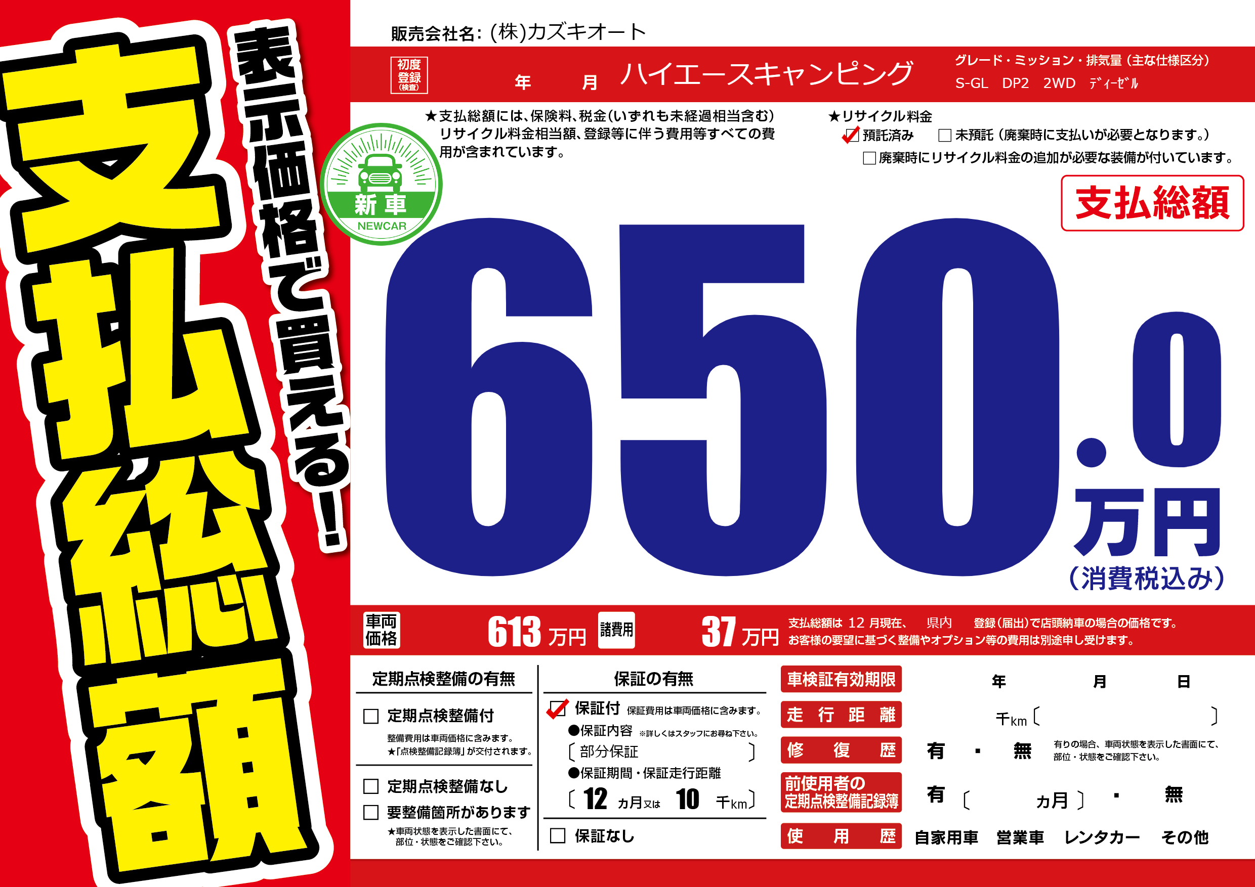 | 車名 | ハイエースキャンピング | グレード ミッション 排気量 |