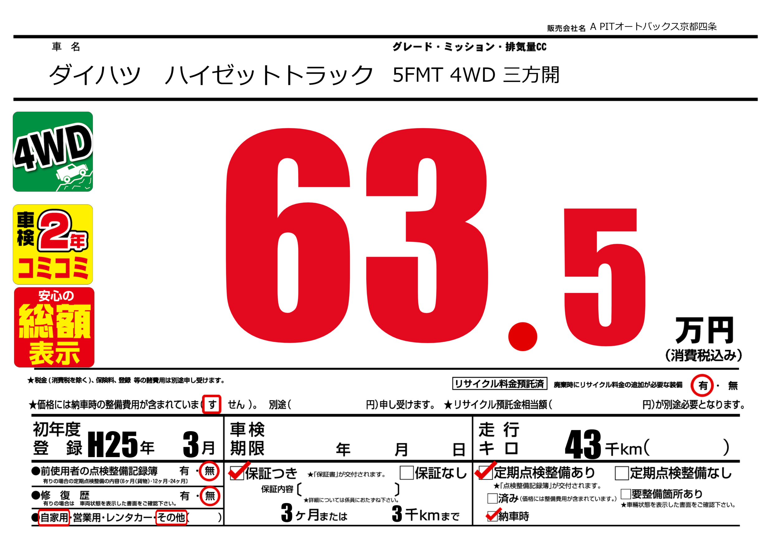 | 車名 | ダイハツ ハイゼットトラック | グレード ミッション 排気量 |