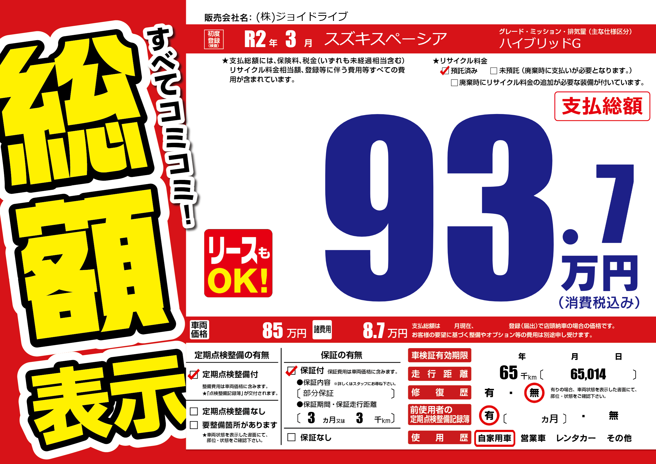| 車名 | スズキスペーシア | グレード ミッション 排気量 |
