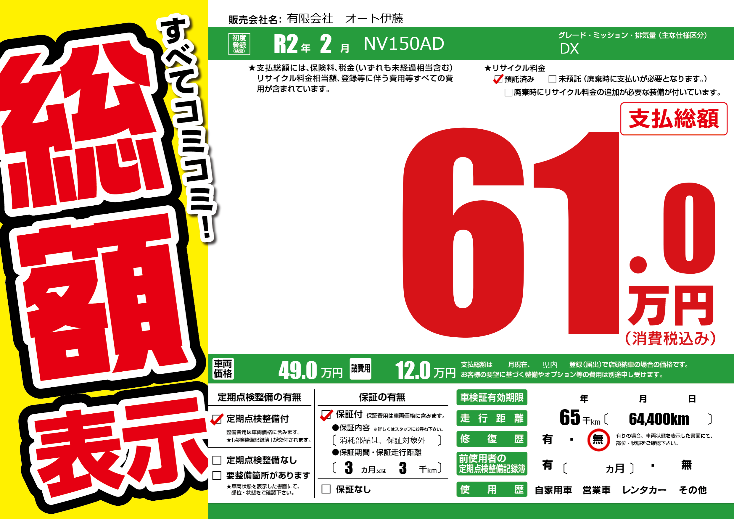 | 車名 | NV150AD | グレード ミッション 排気量 |