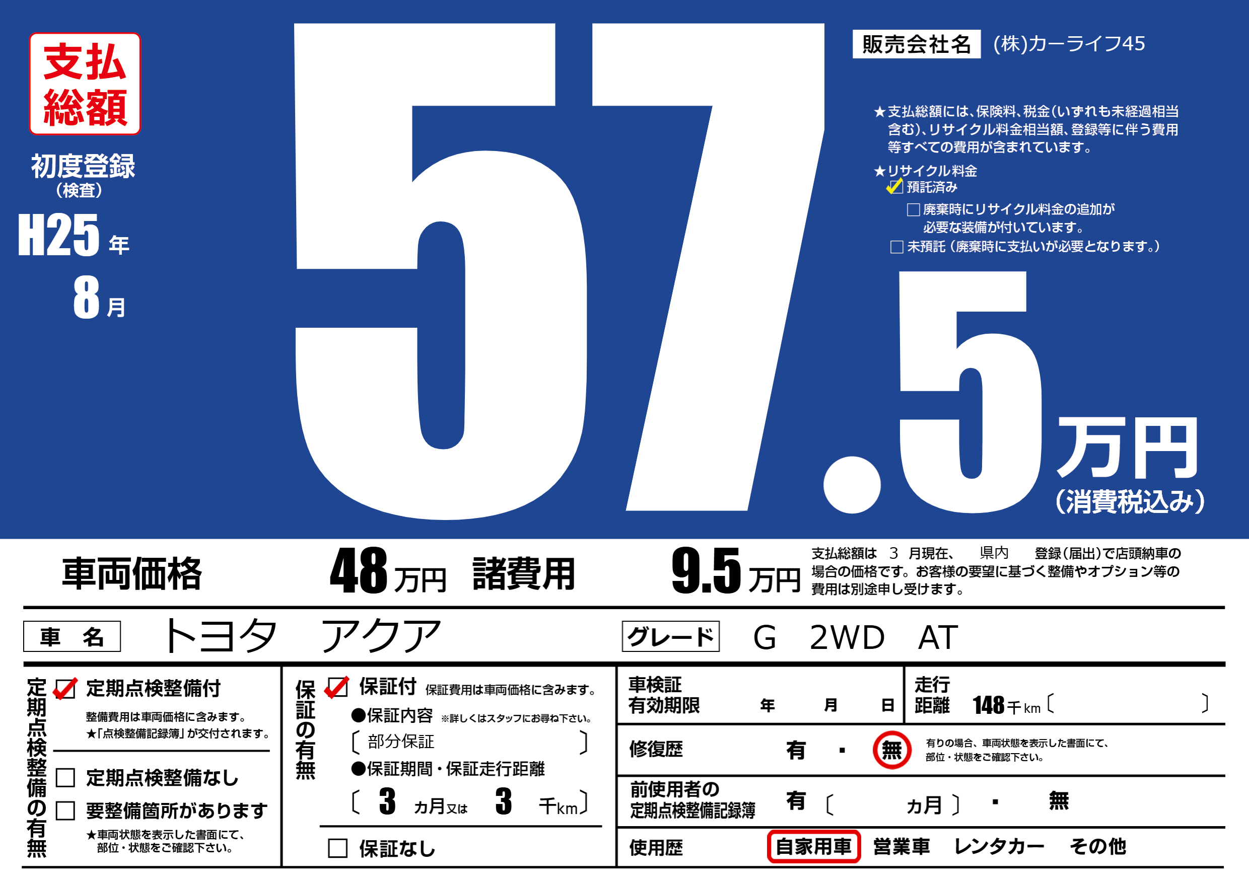 | 走行キロ | 14.8万km | 初年度登録 | H25年8月 |