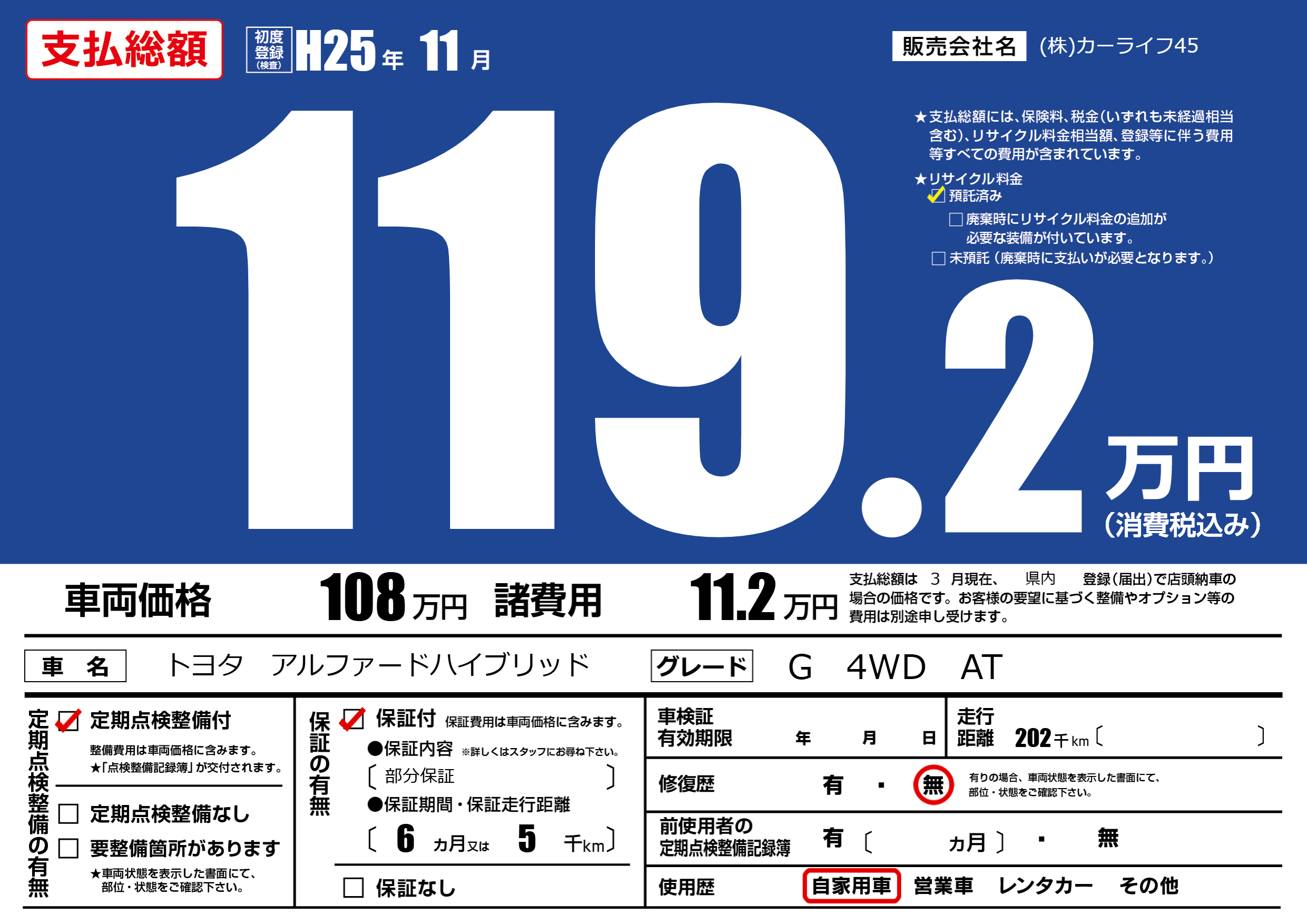 | 走行キロ | 20.2万km | 初年度登録 | H25年11月 |