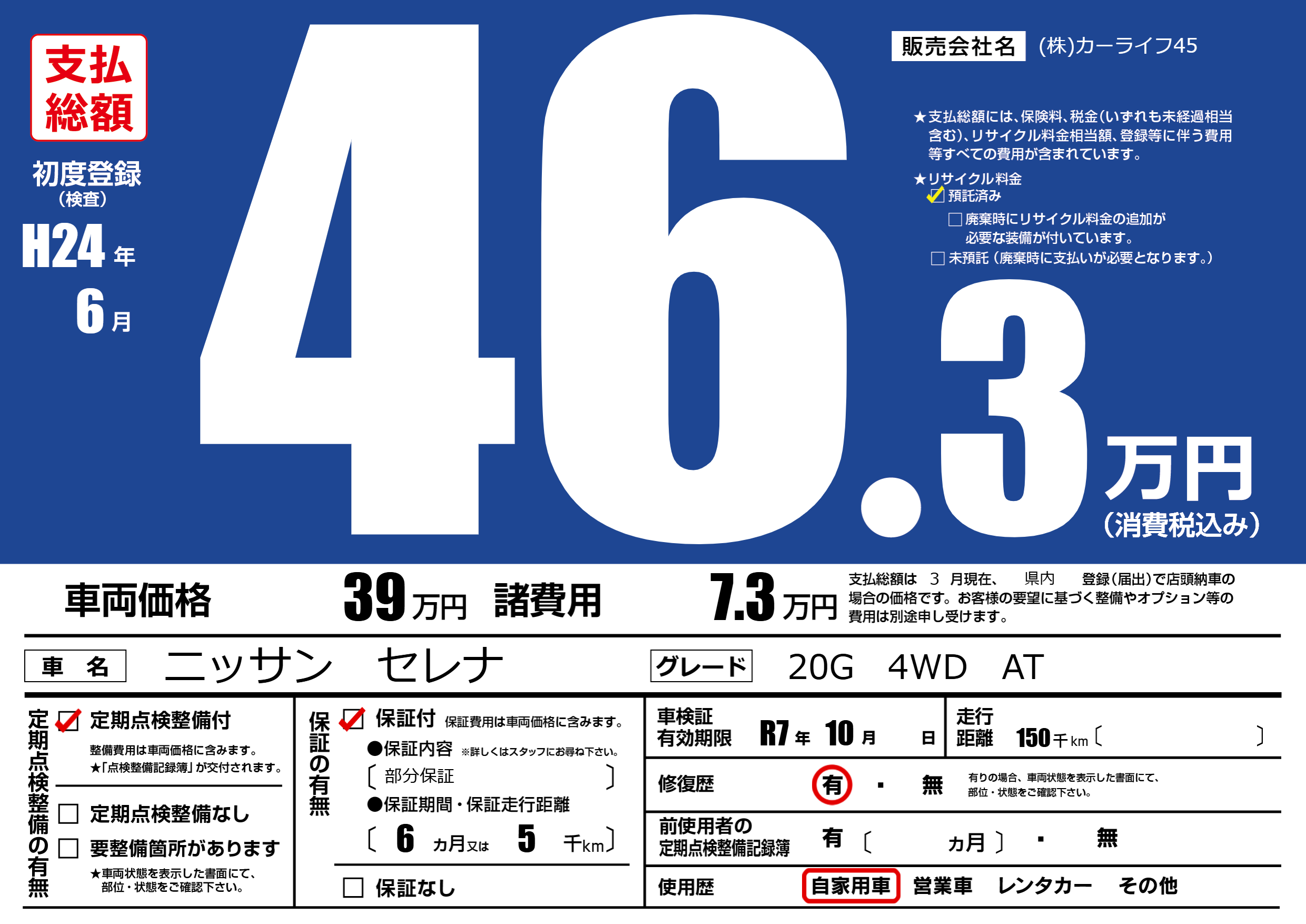| 走行キロ | 15万km | 初年度登録 | H24年6月 |