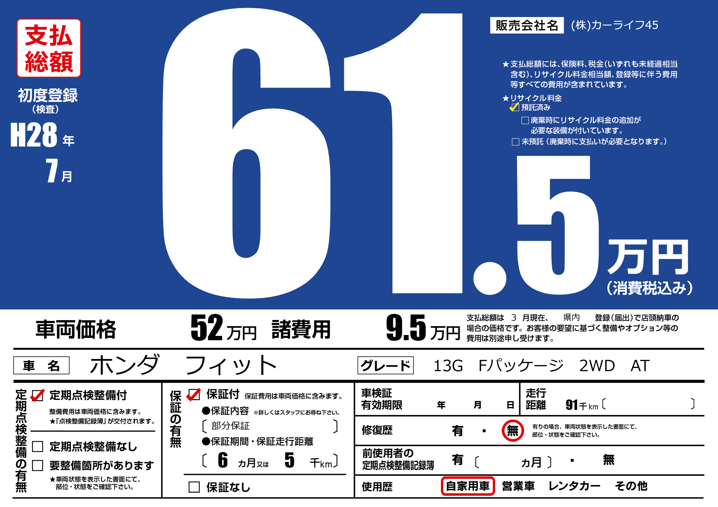 保証付き 保証内容(部分保証) 6ヶ月または(5)千kmまで |