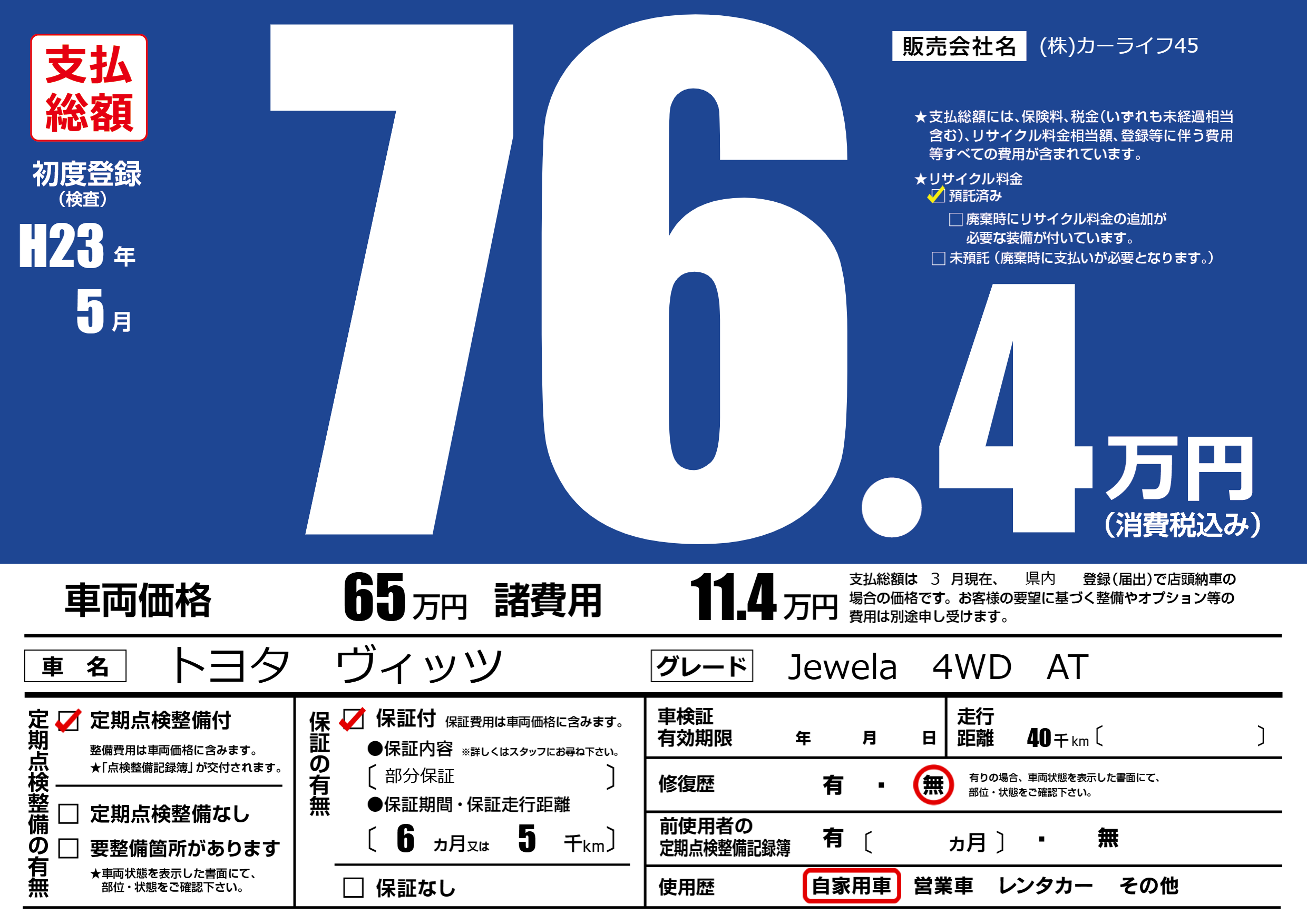 | 走行キロ | 4万km | 初年度登録 | H23年5月 |