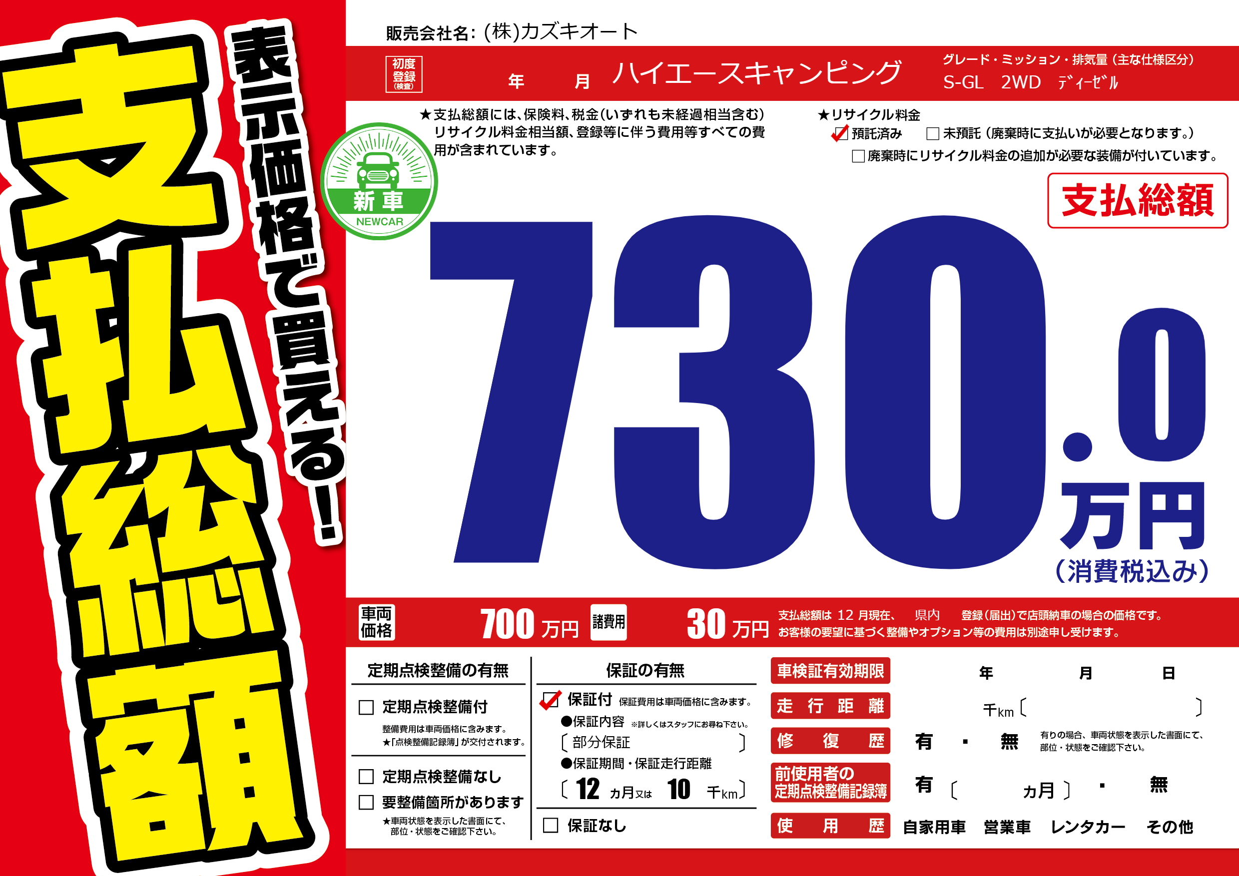 | 車名 | ハイエースキャンピング | グレード ミッション 排気量 |