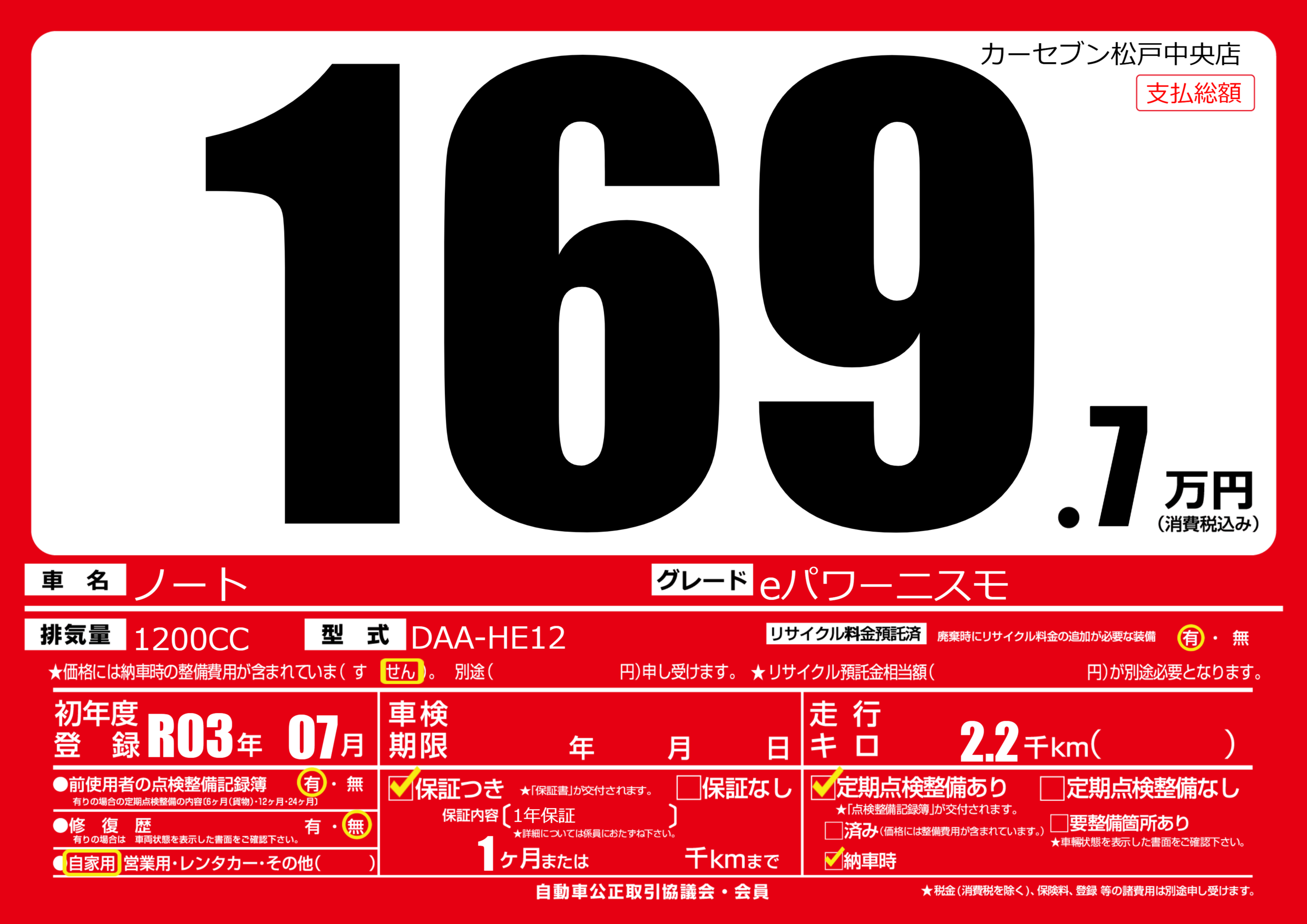 | 走行キロ | 0.2万km | 初年度登録 | R03年07月 |