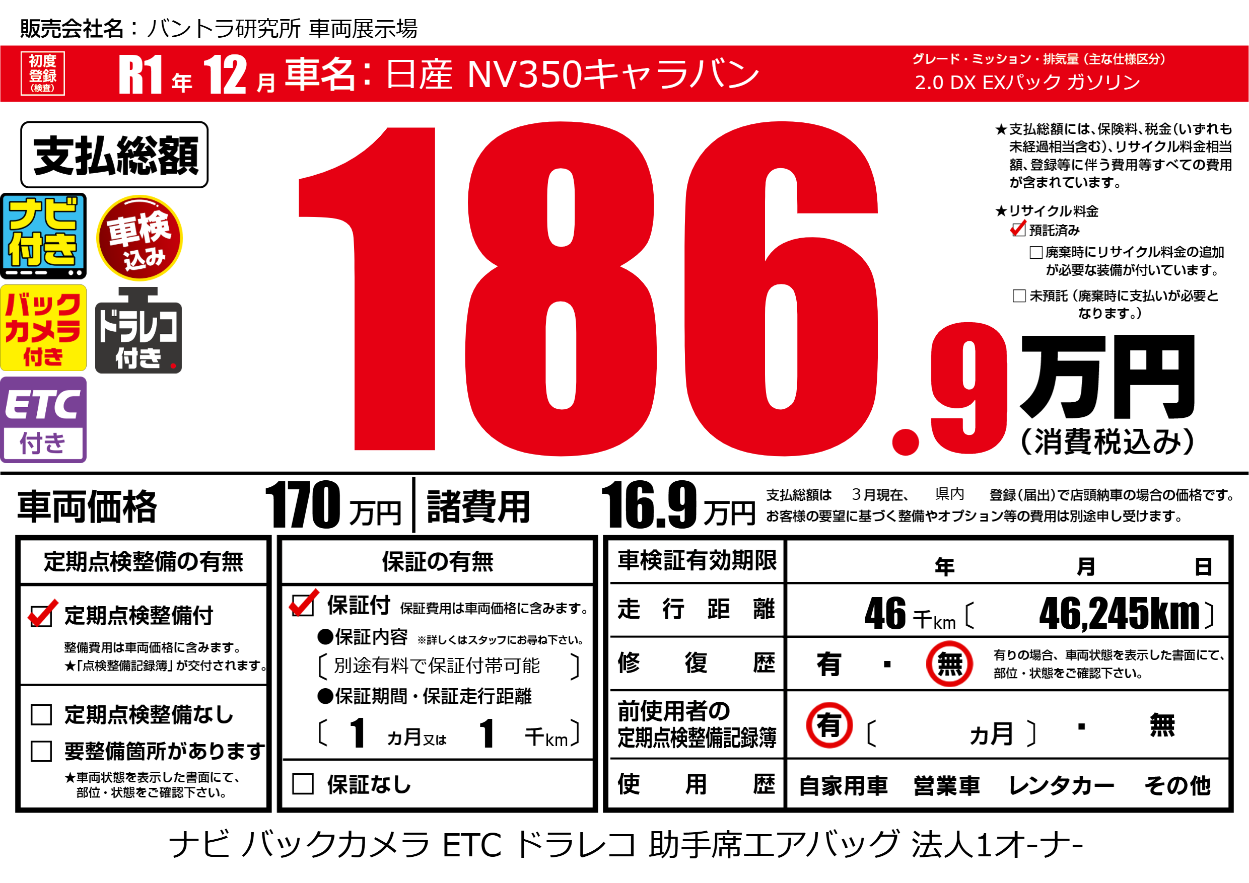 | 車名 | 日産 NV350キャラバン | グレード ミッション 排気量 |