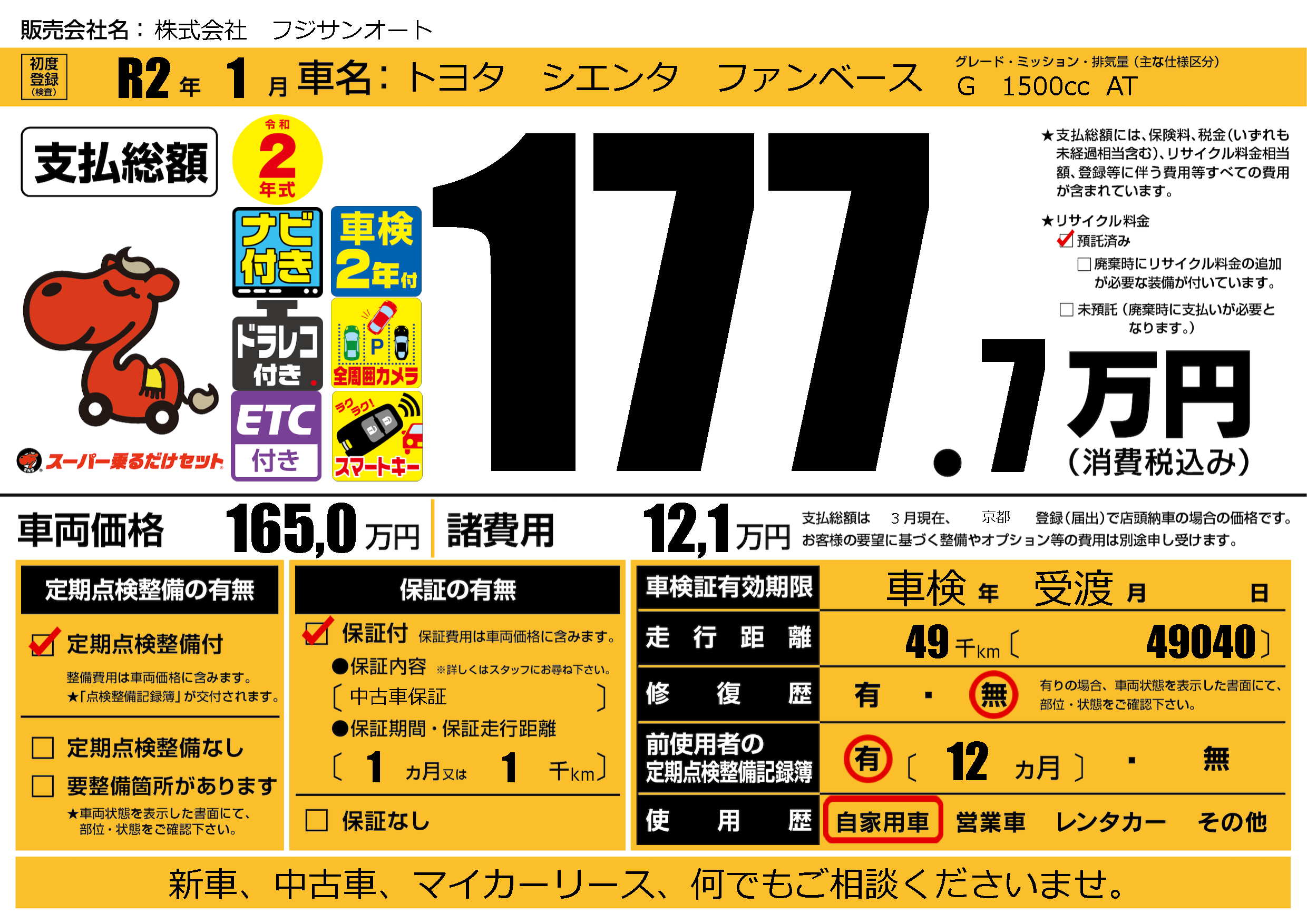 | 車名 | トヨタ シエンタ ファンベース | グレード ミッション 排気量 |