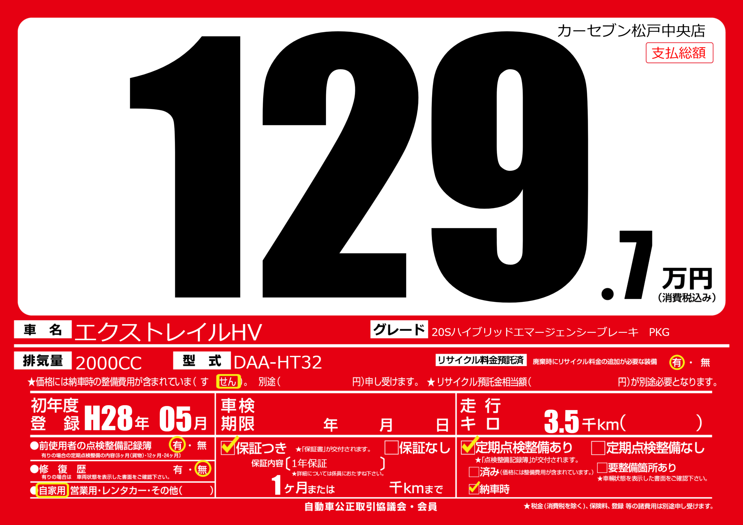 | 車名 | エクストレイルHV | グレード ミッション 排気量 |