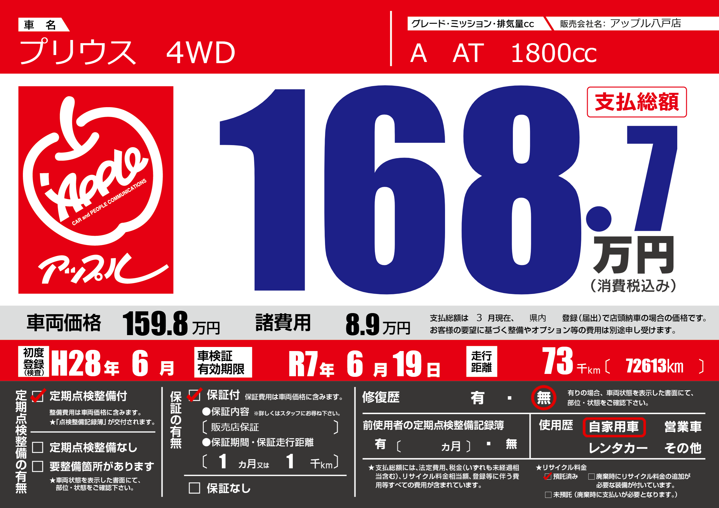 | 車名 | プリウス 4WD | グレード ミッション 排気量 |