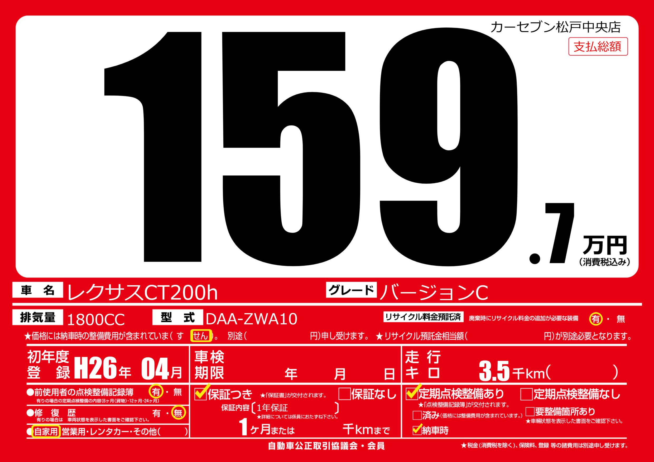 | 車名 | レクサスCT200h | グレード ミッション 排気量 |