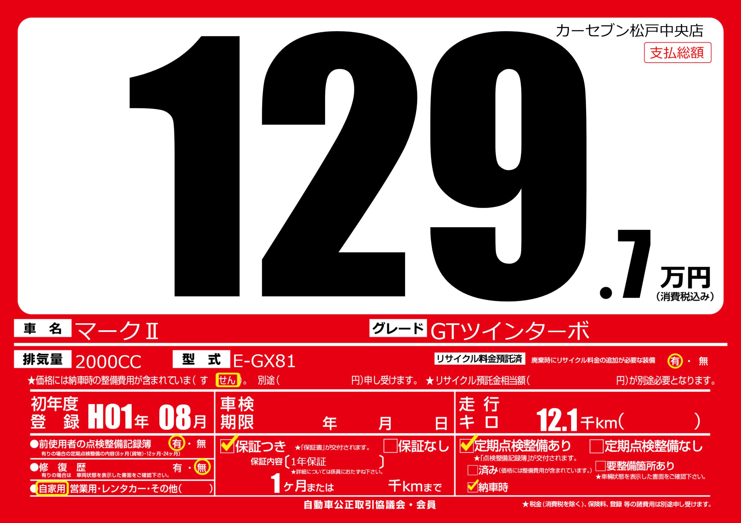 | 車名 | マークⅡ | グレード ミッション 排気量 |