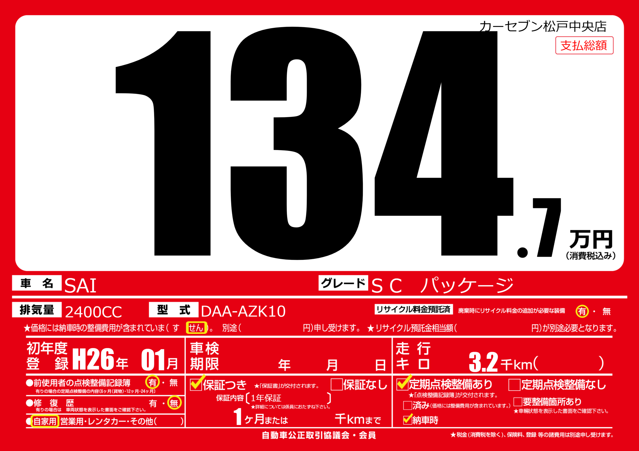 | 車名 | SAI | グレード ミッション 排気量 |