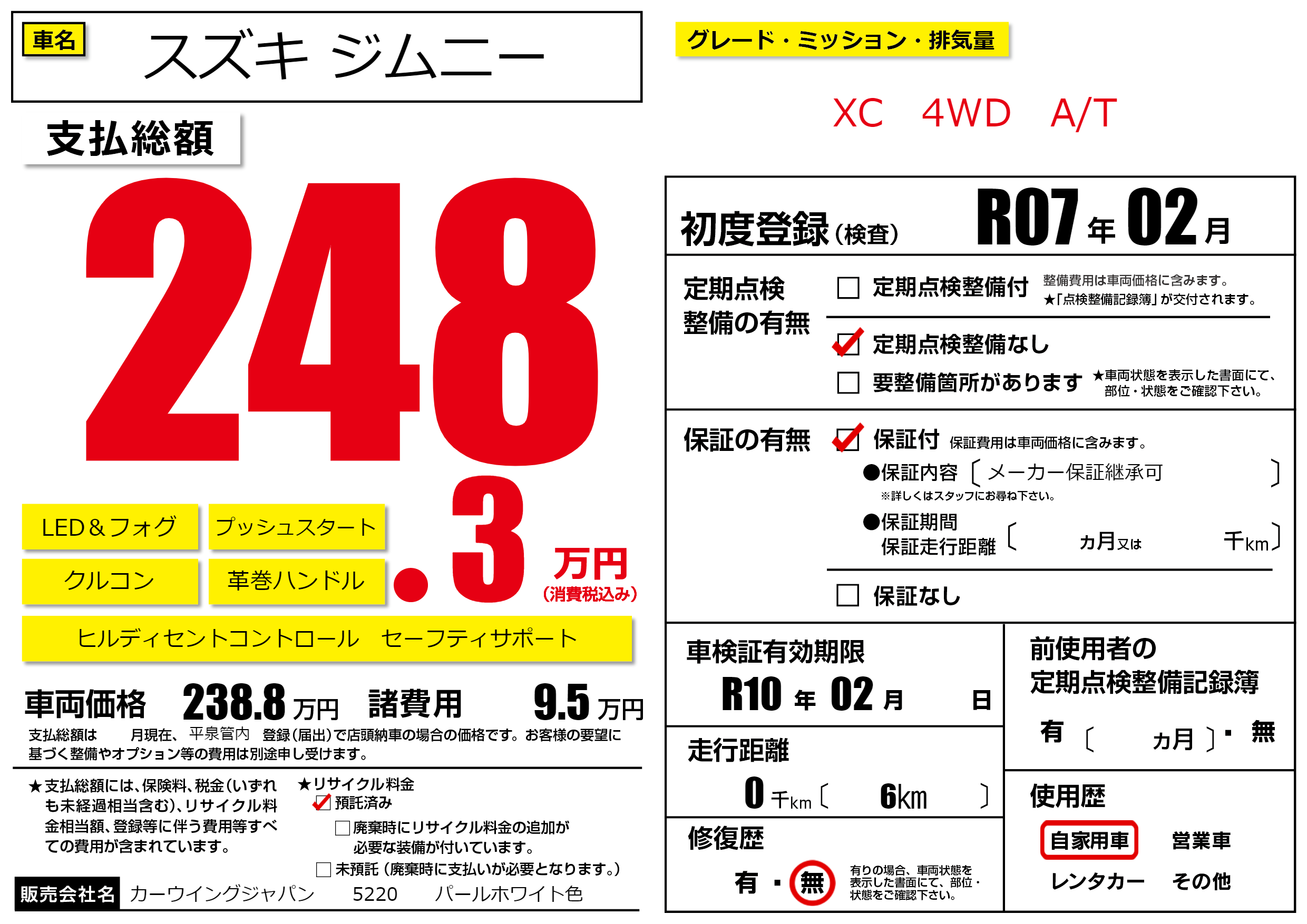 | 車検制限 | R10年 02月 - 日 | ||