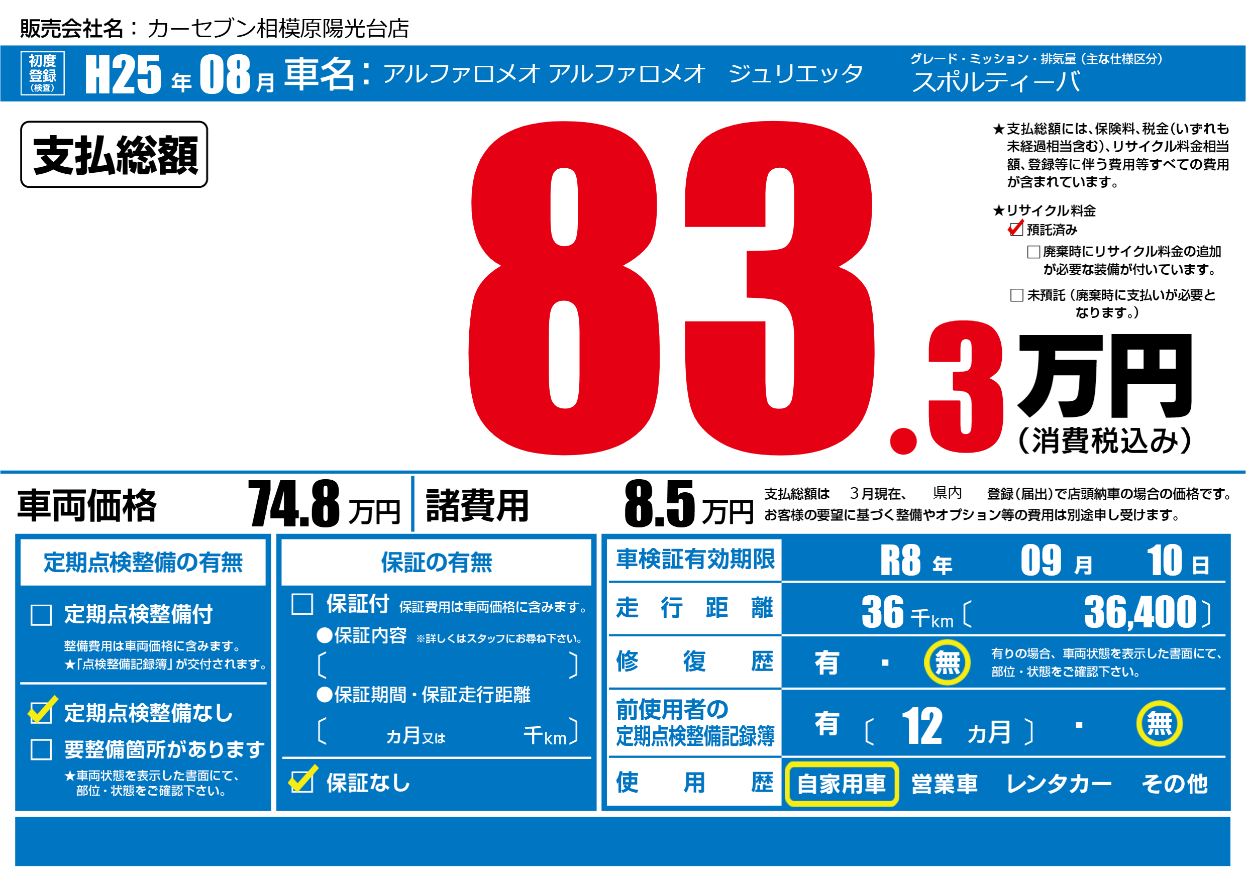 なし | 車検制限 | R8年09月10月 |