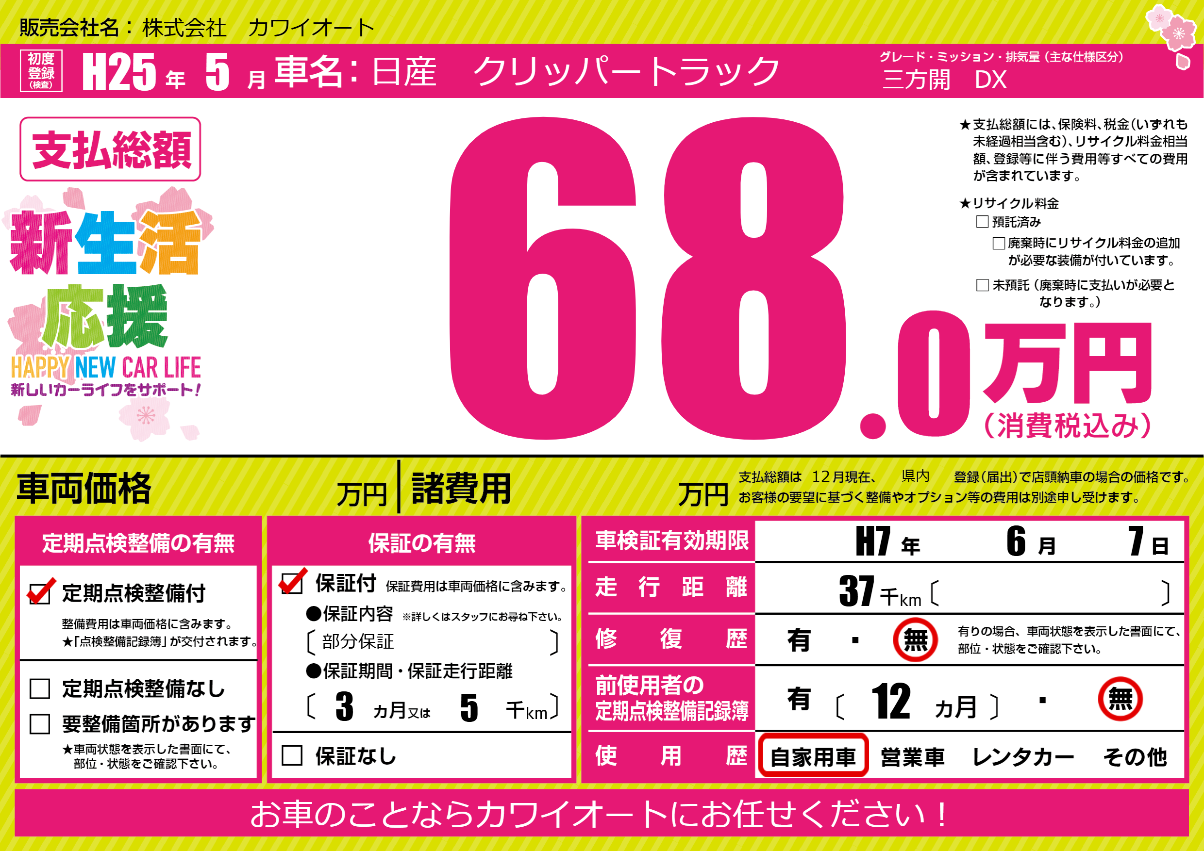 保証付き 保証内容(部分保証) 3ヶ月または(5)千kmまで |