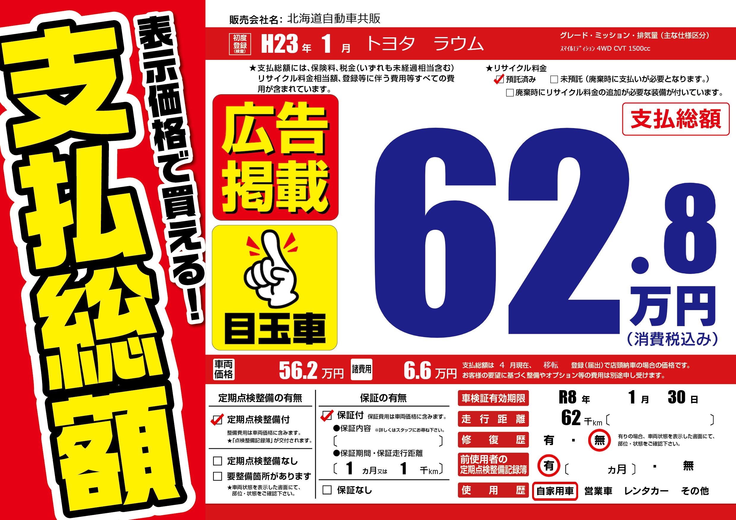 | 走行キロ | 6.2万km | 初年度登録 | H23年1月 |