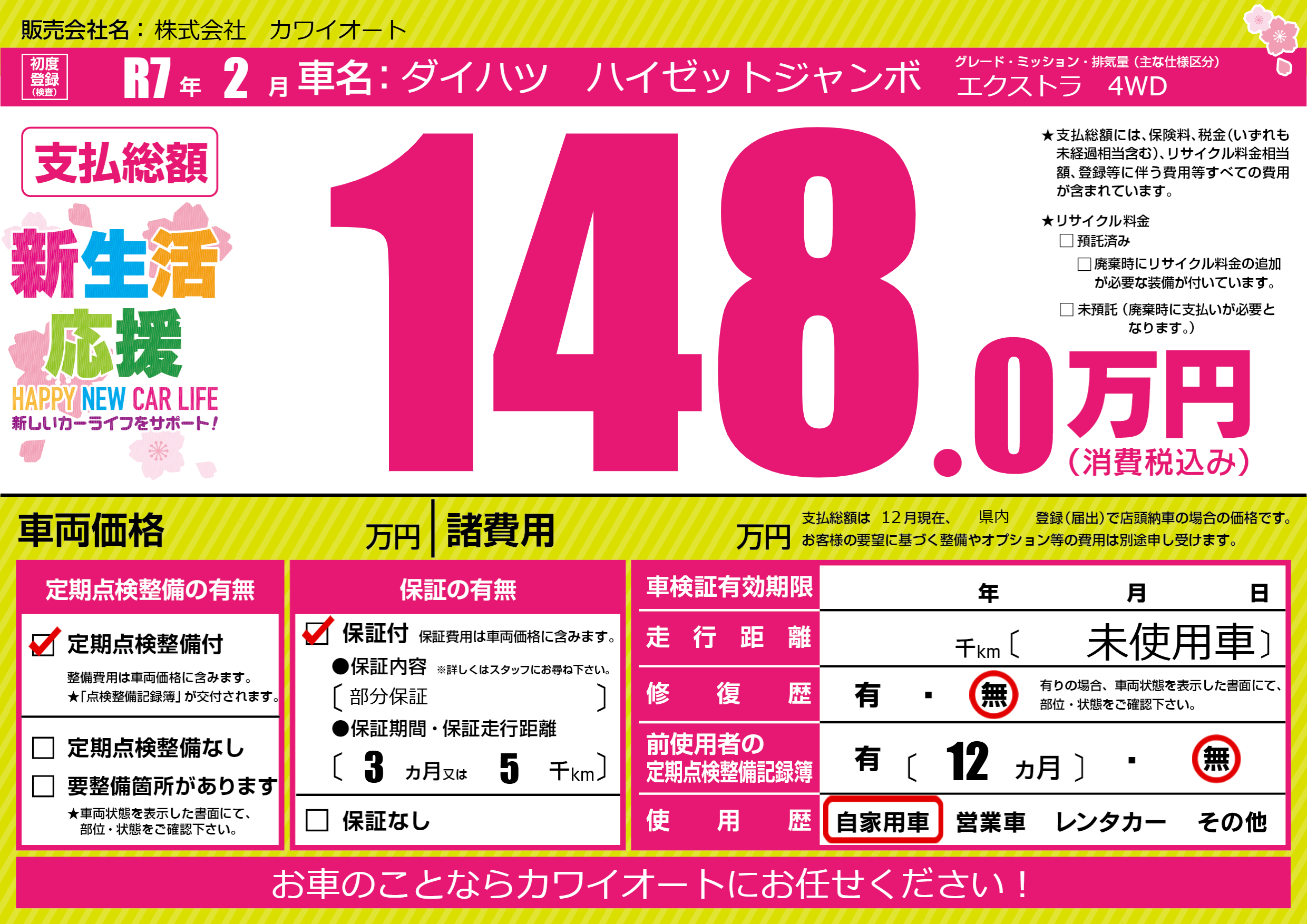 保証付き 保証内容(部分保証) 3ヶ月または(5)千kmまで |