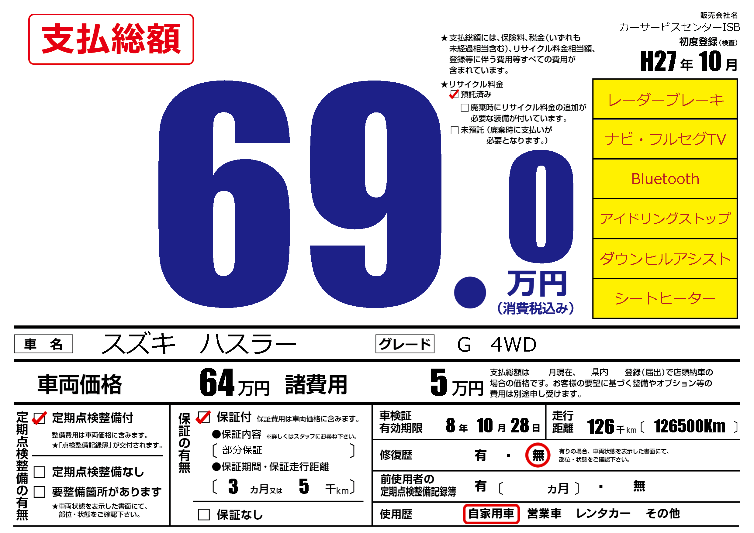 | 走行キロ | 12.6万km | 初年度登録 | H27年10月 |