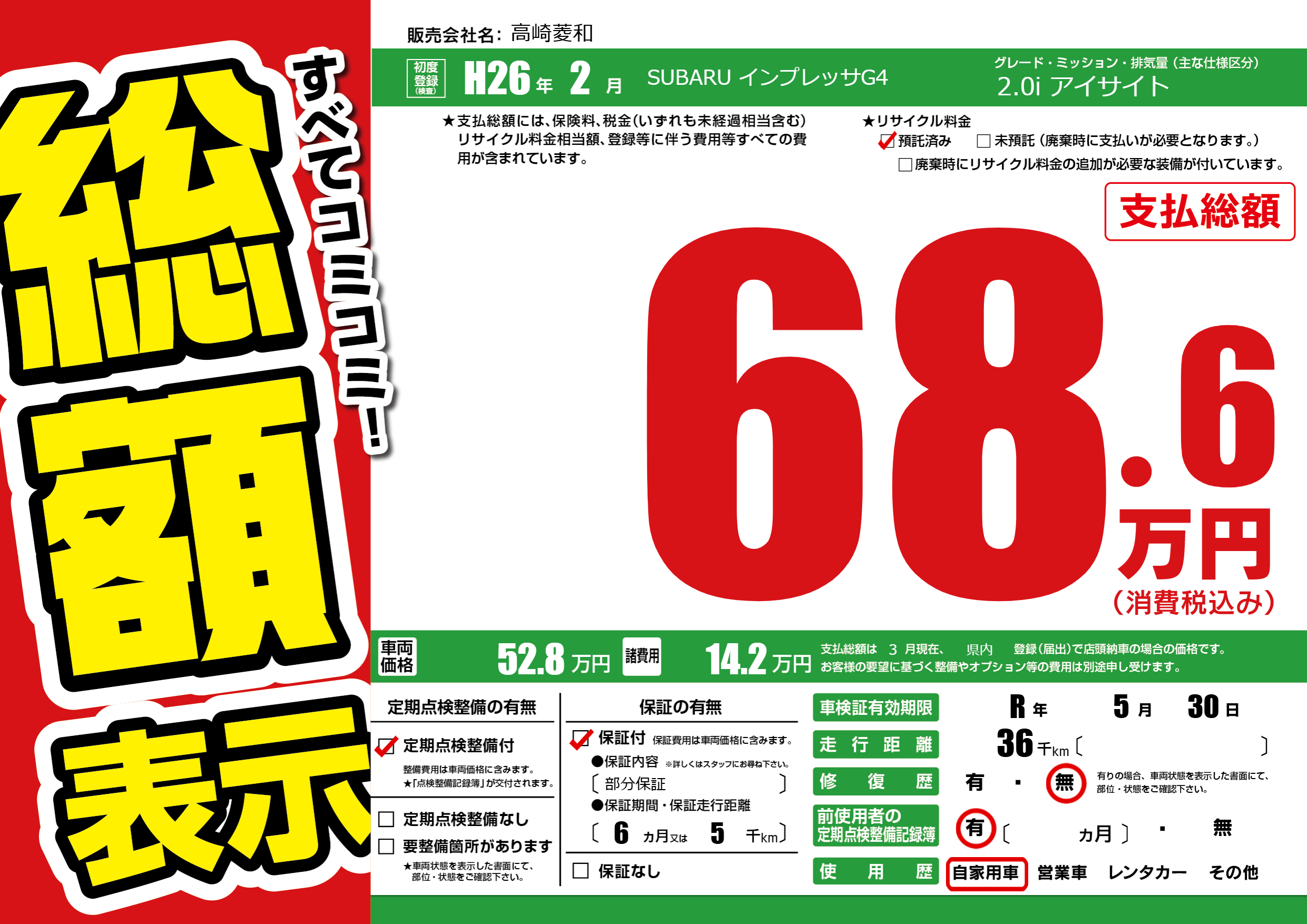 | 車名 | SUBARU インプレッサG4 | グレード ミッション 排気量 |