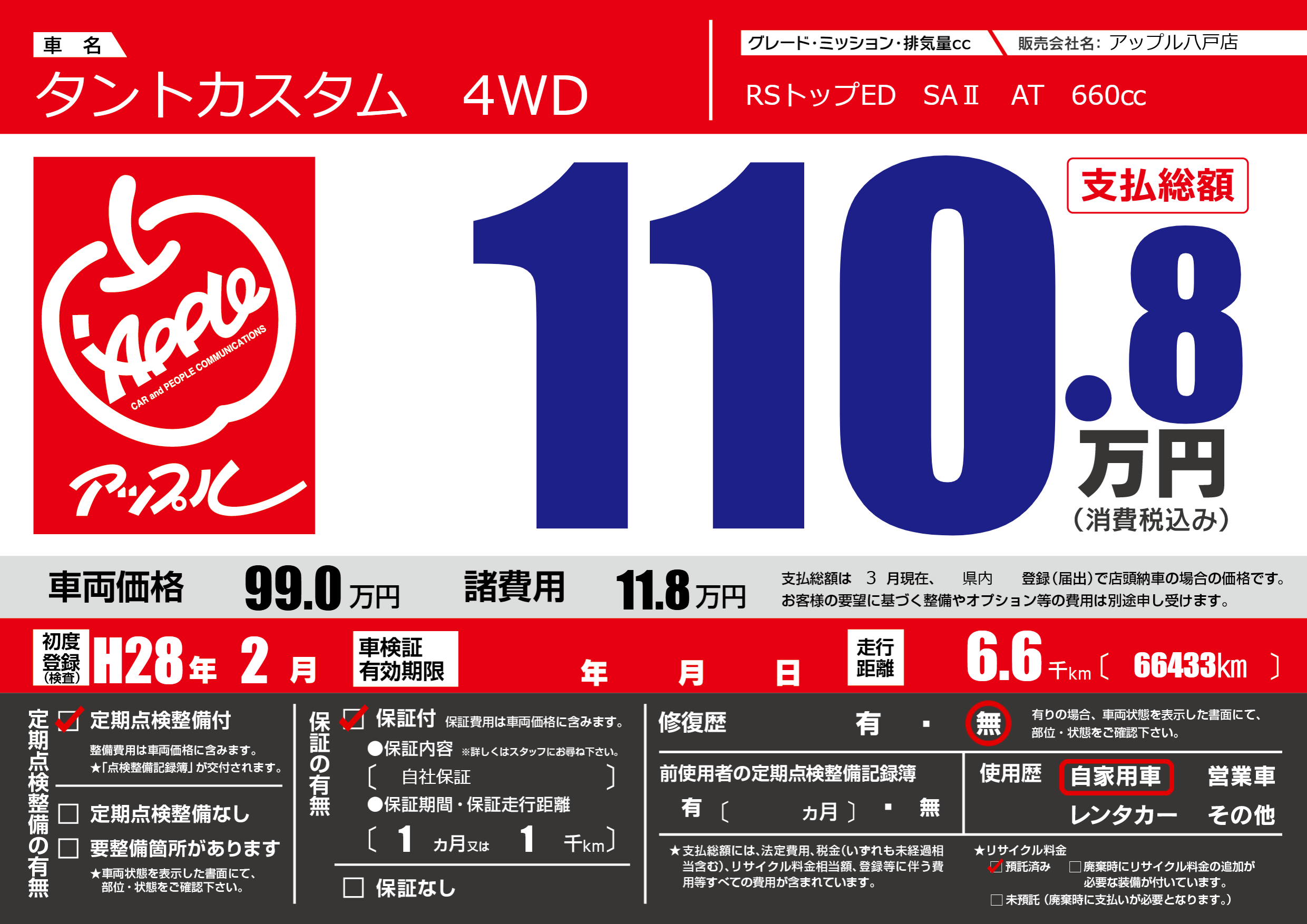 | 車名 | タントカスタム 4WD | グレード ミッション 排気量 |