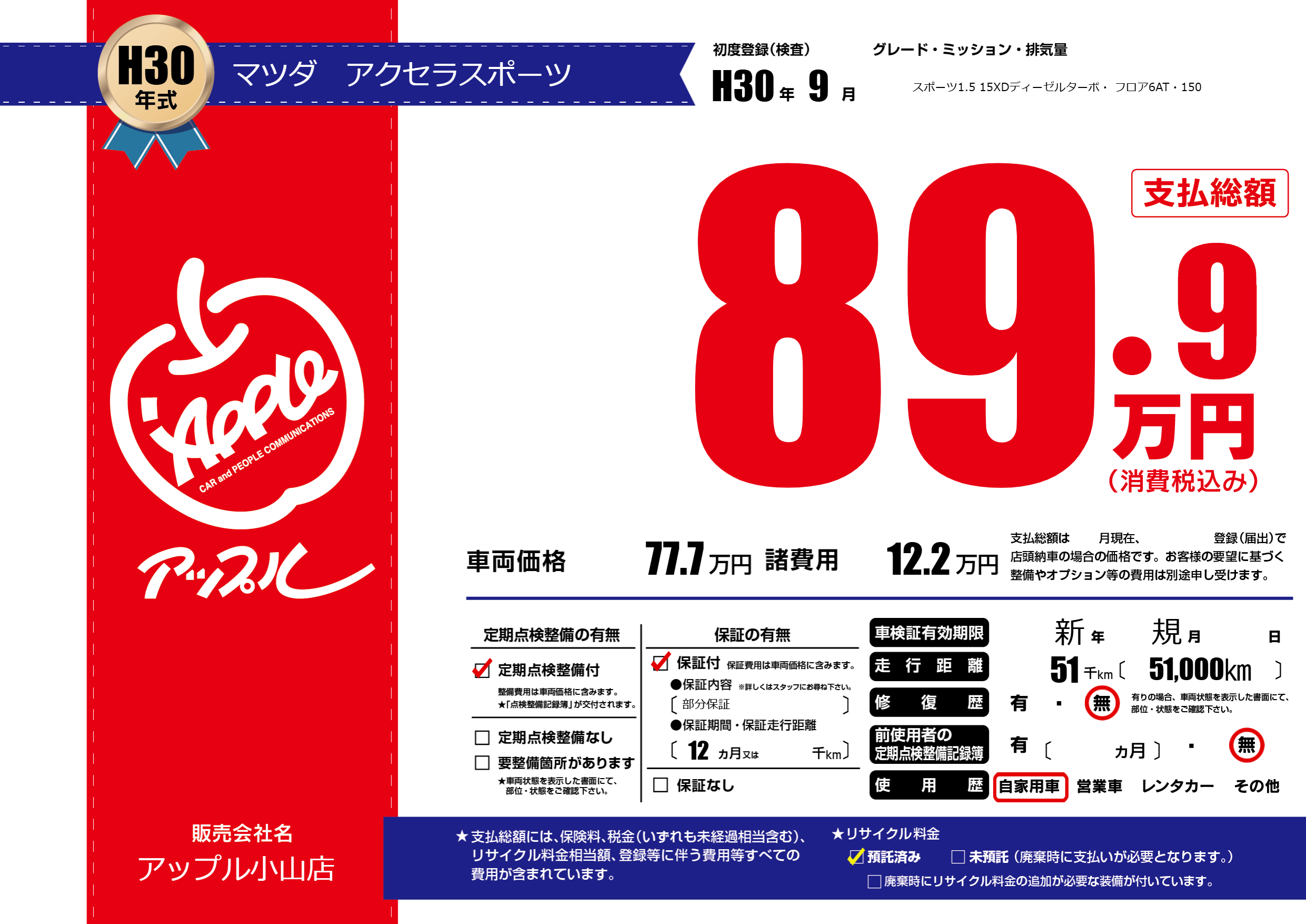 | 車名 | マツダ アクセラスポーツ | グレード ミッション 排気量 |