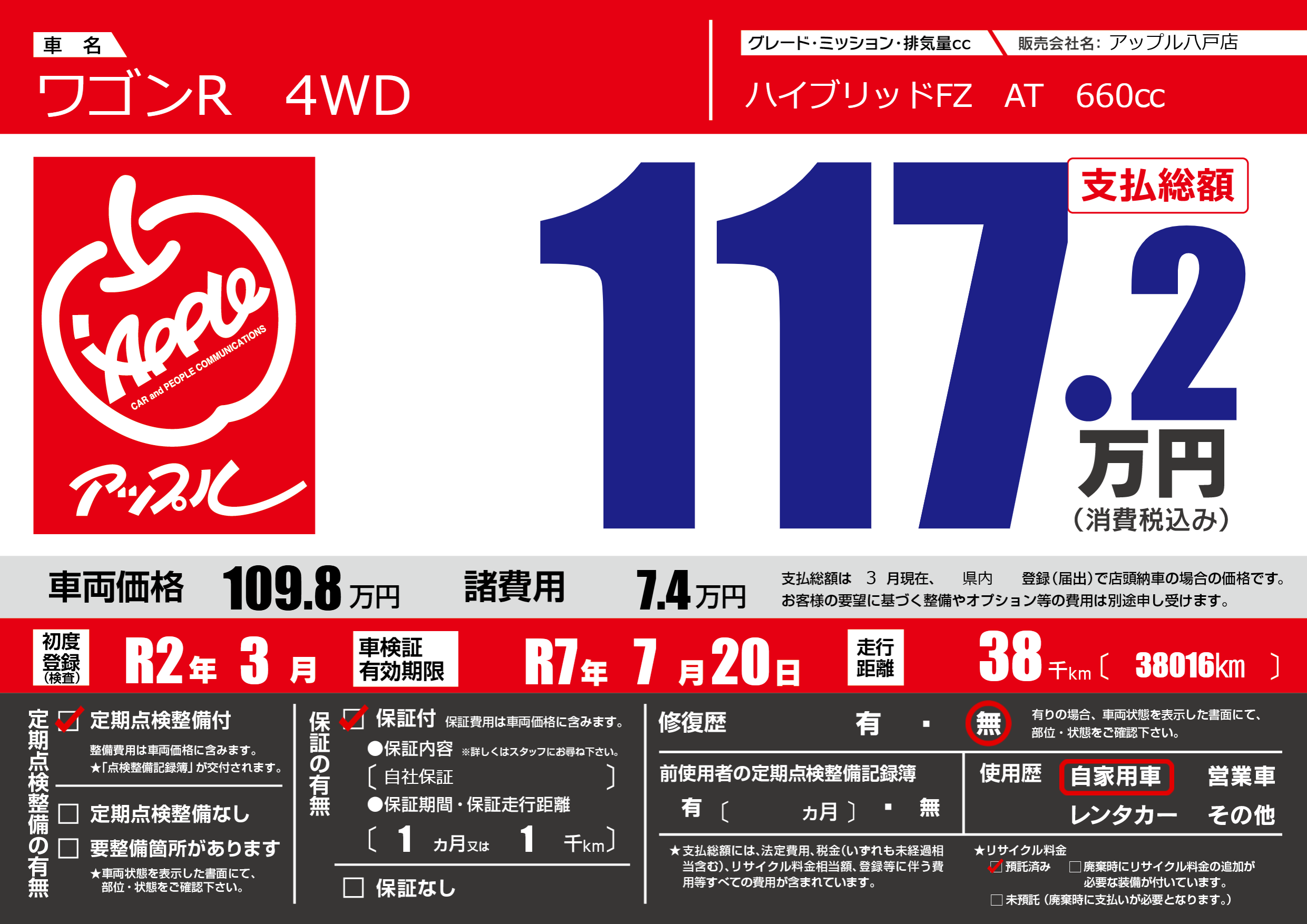 | 車名 | ワゴンR 4WD | グレード ミッション 排気量 |