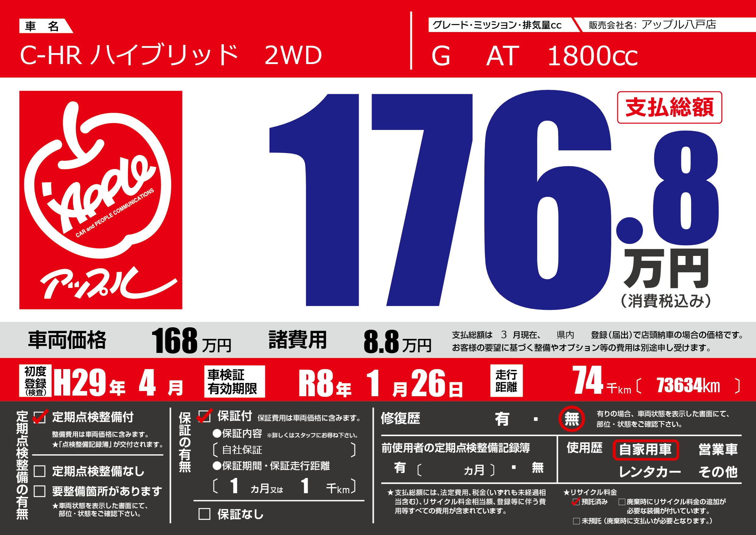 | 車名 | C-HR ハイブリッド 2WD | グレード ミッション 排気量 |