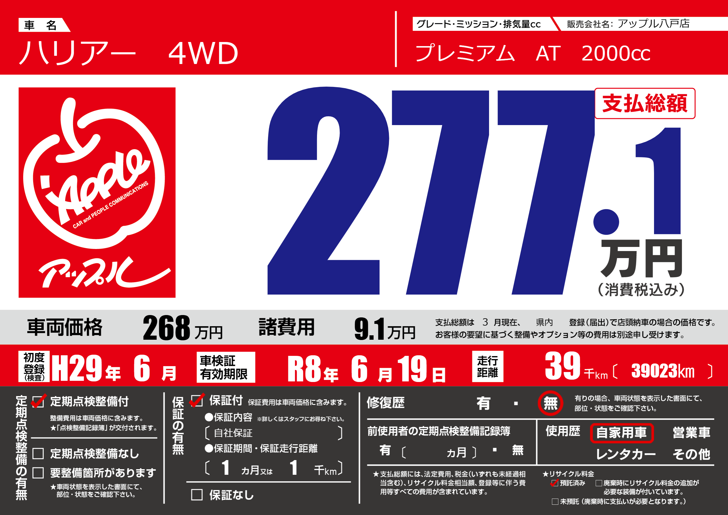 | 車名 | ハリアー 4WD | グレード ミッション 排気量 |