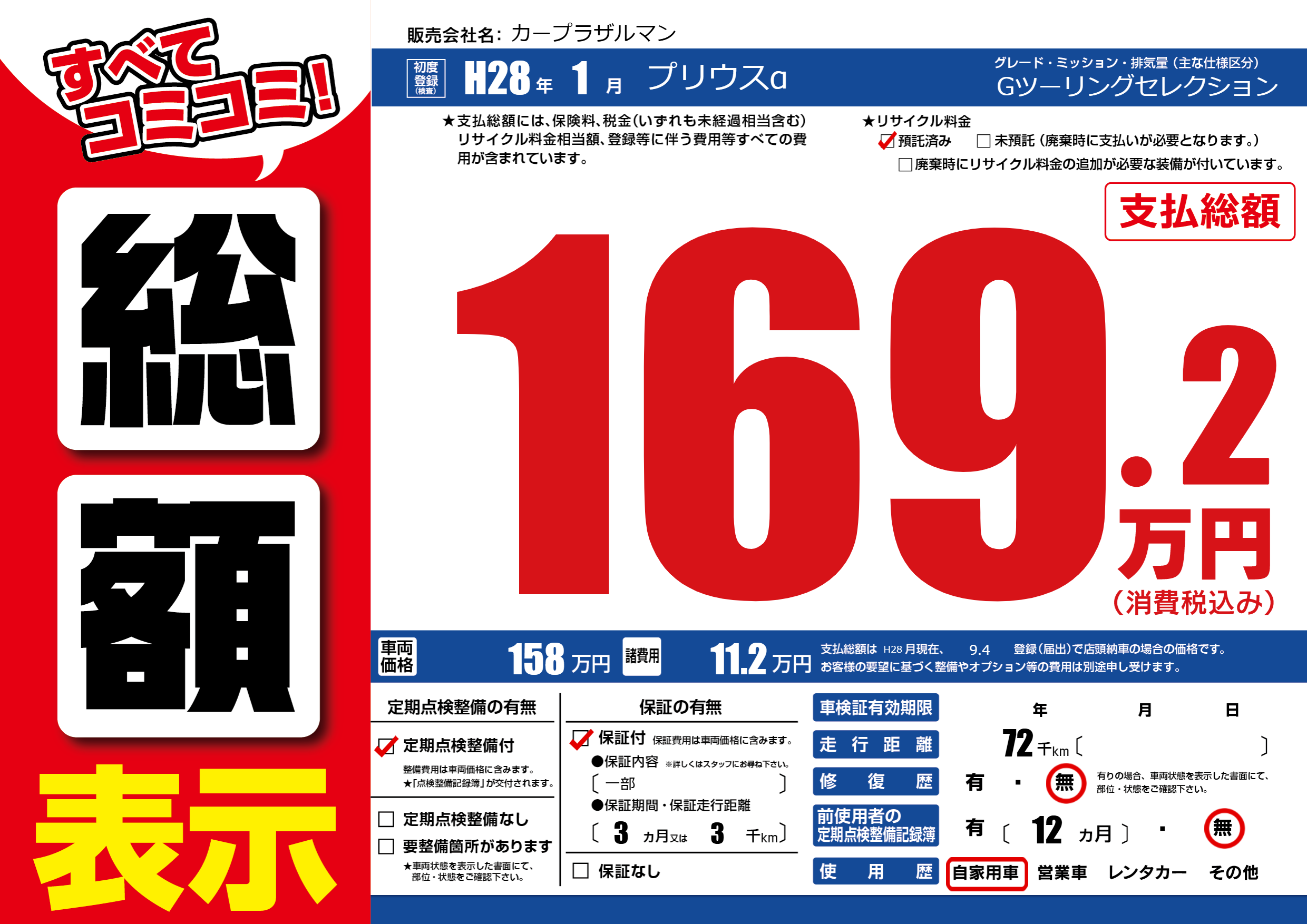 | 車名 | プリウスα | グレード ミッション 排気量 |