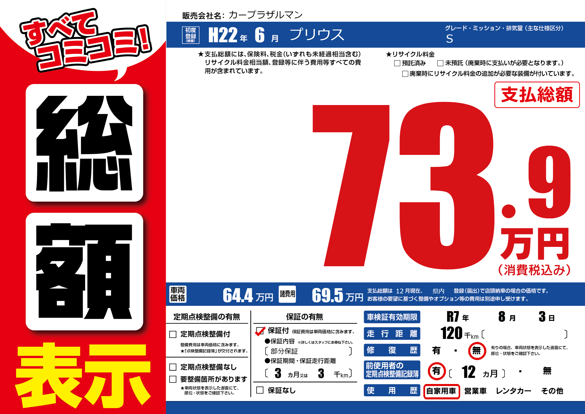 | 車名 | プリウス | グレード ミッション 排気量 |