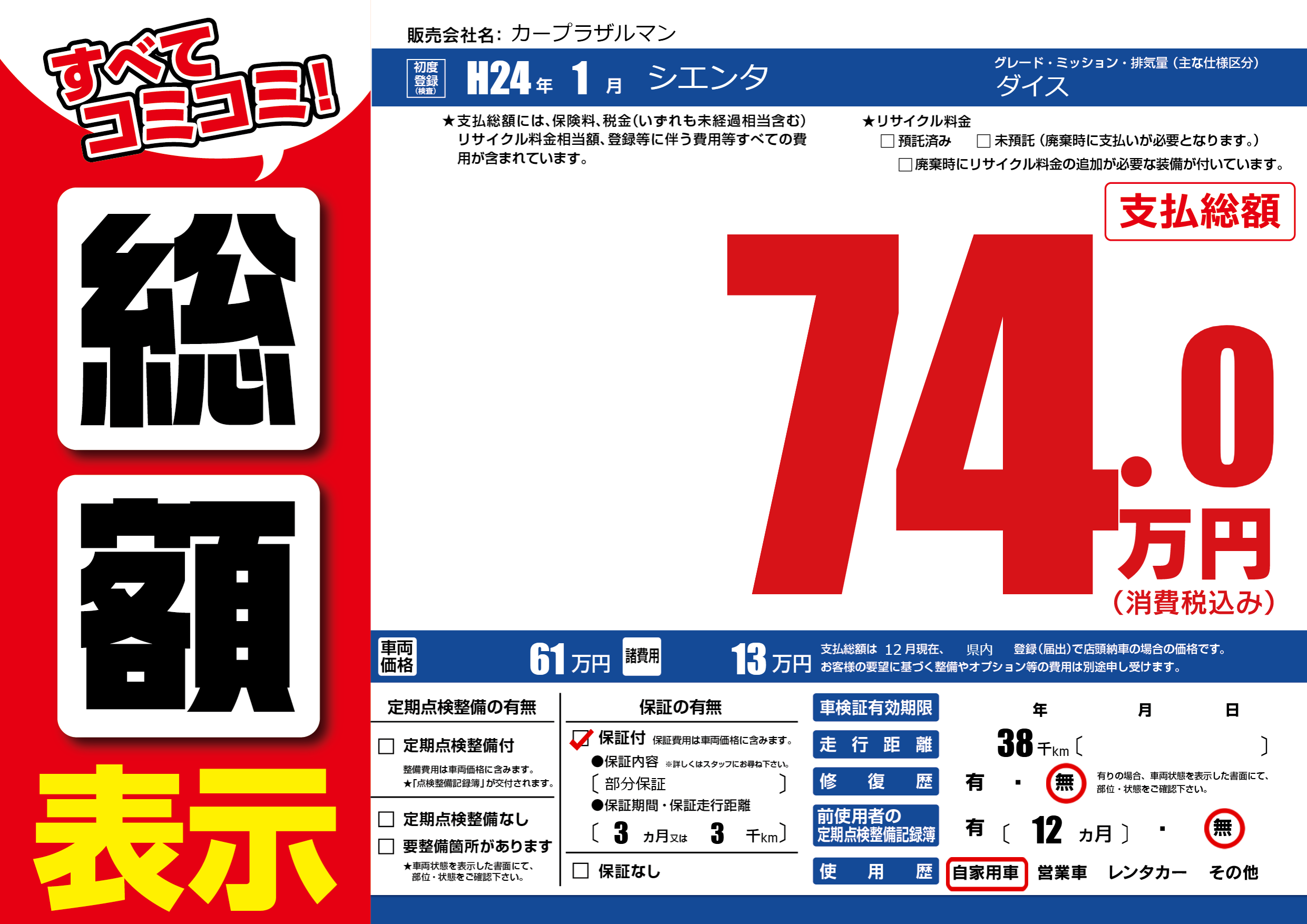 | 車名 | シエンタ | グレード ミッション 排気量 |