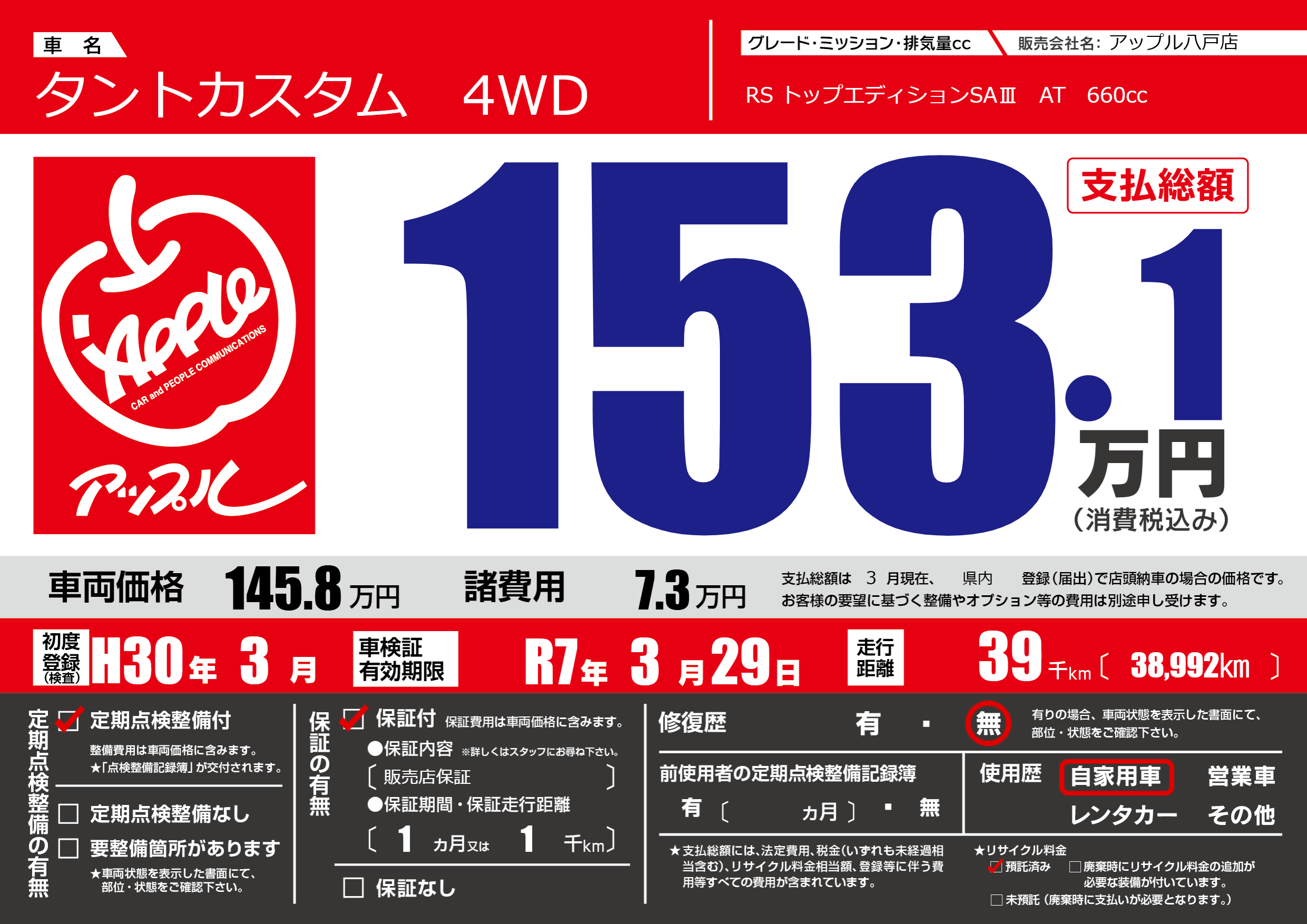 | 走行キロ | 3.9万km | 初年度登録 | H30年3月 |