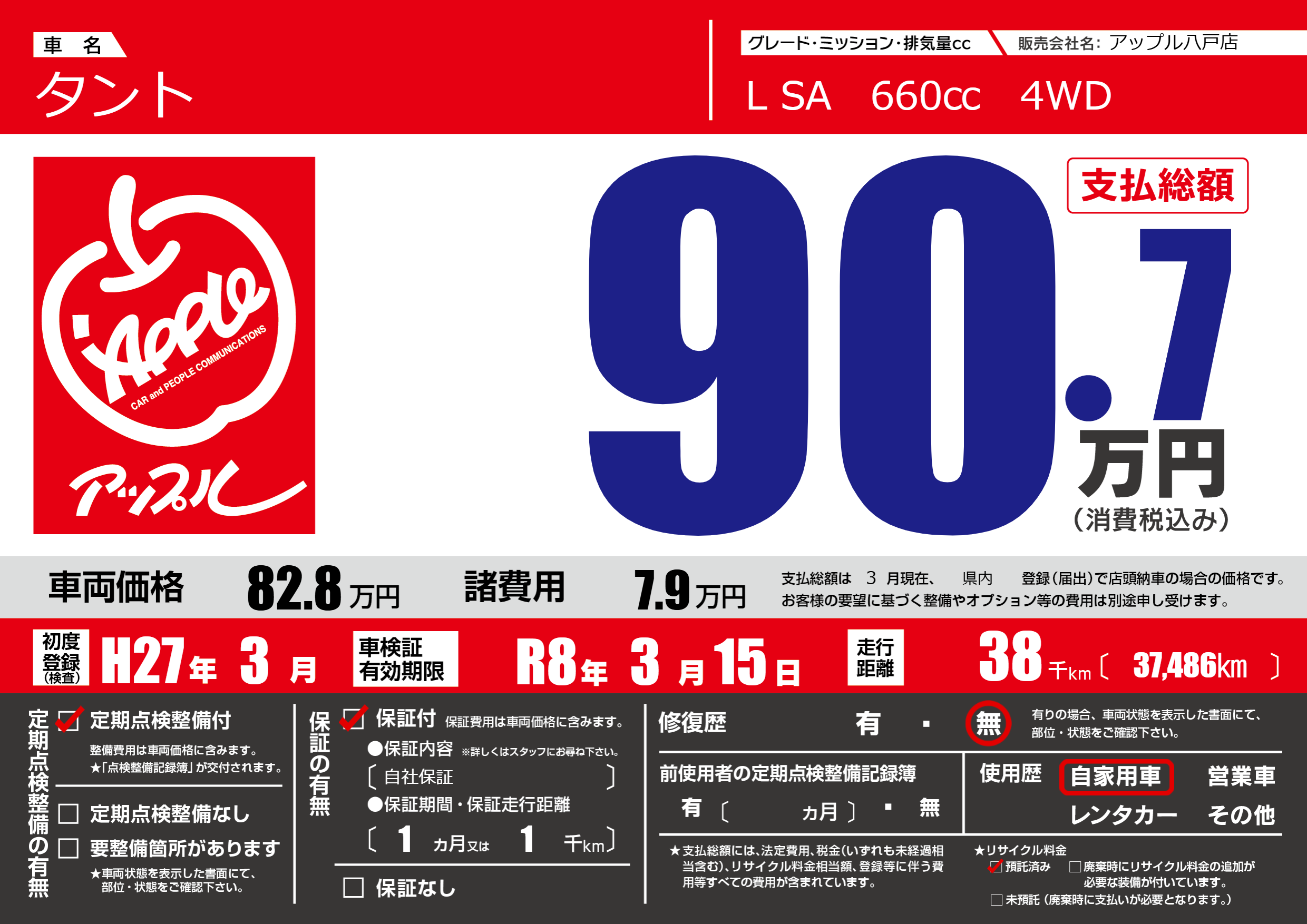 | 走行キロ | 3.8万km | 初年度登録 | H27年3月 |