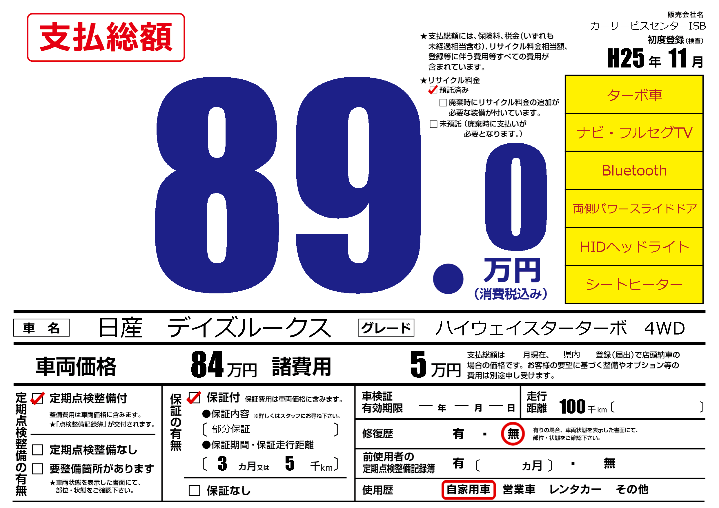 | 走行キロ | 10万km | 初年度登録 | H25年11月 |
