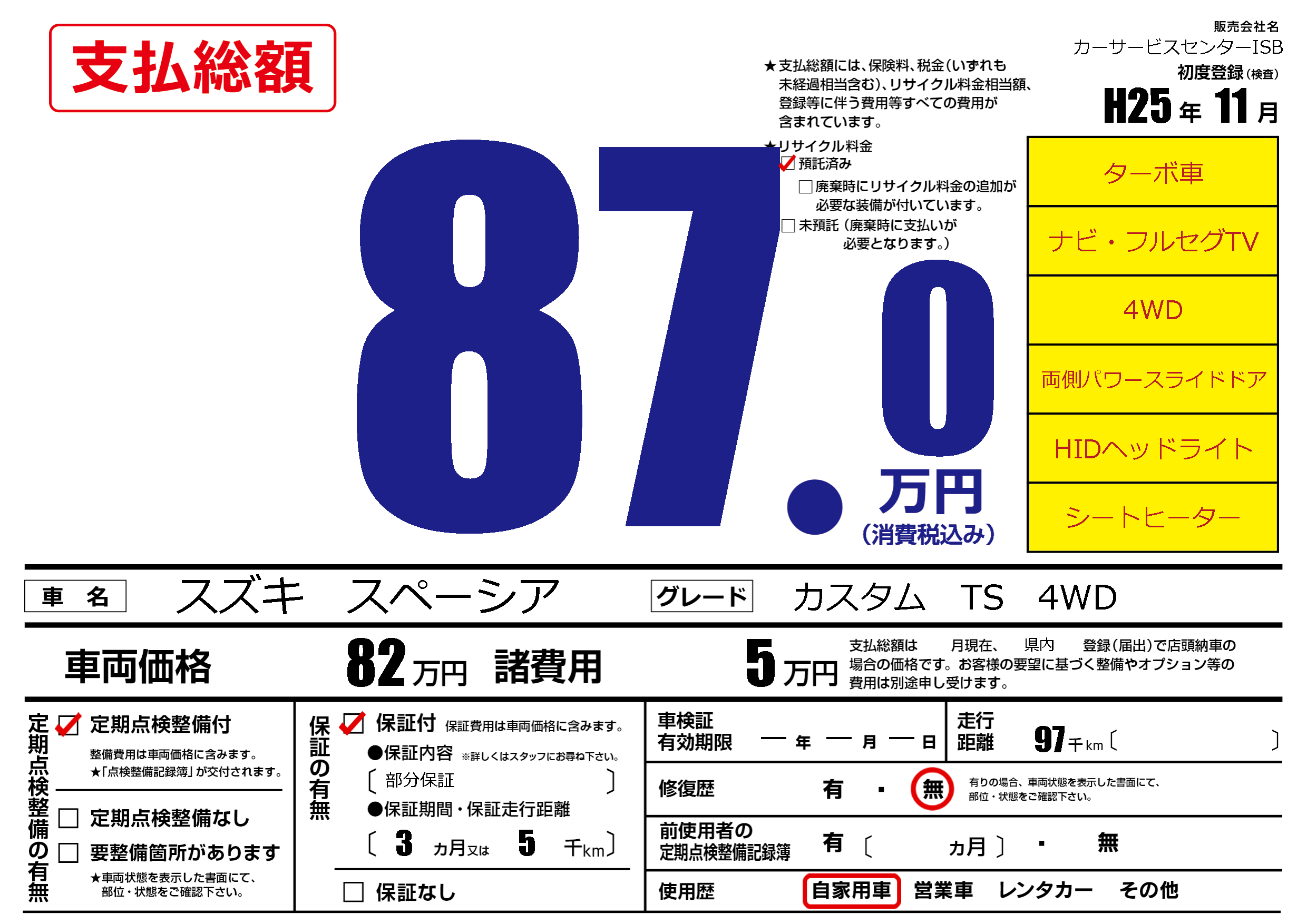 | 走行キロ | 9.7万km | 初年度登録 | H25年11月 |