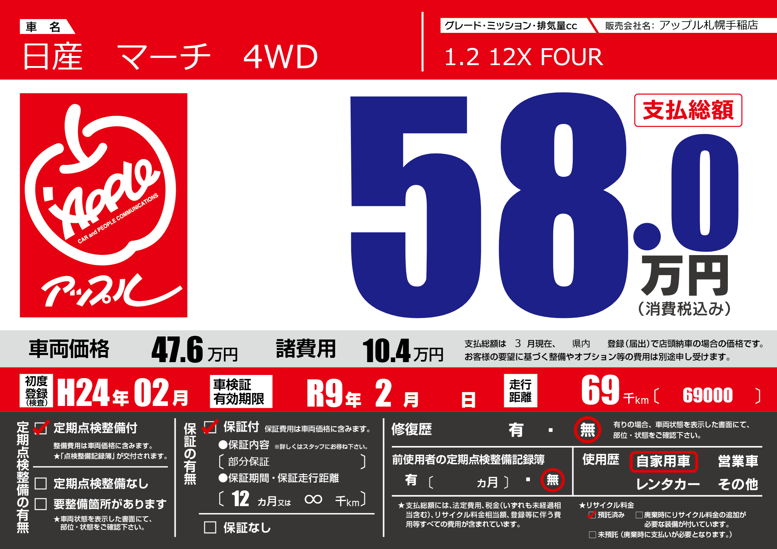 | 車名 | 日産 マーチ 4WD | グレード ミッション 排気量 |