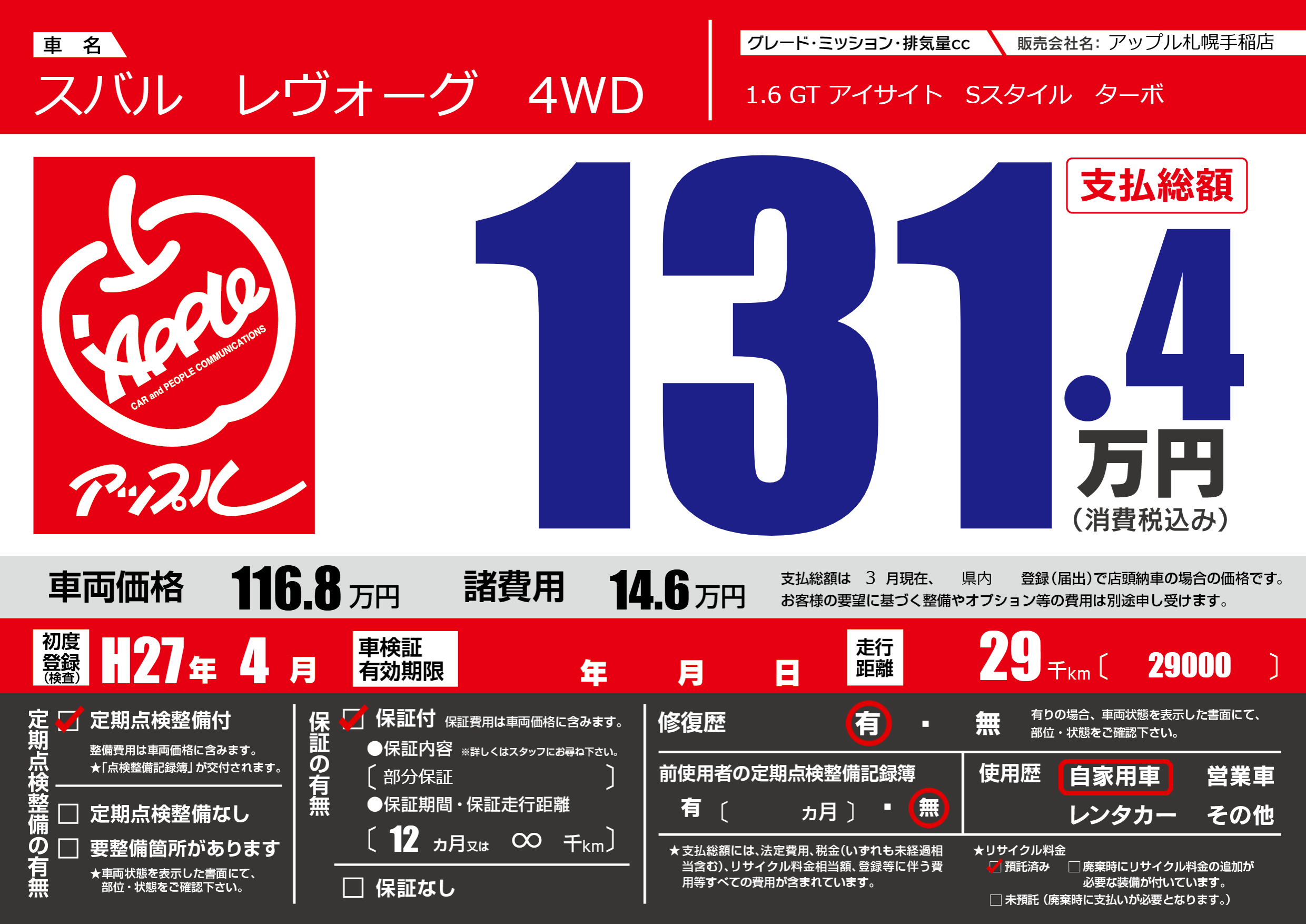 | 車名 | スバル レヴォーグ 4WD | グレード ミッション 排気量 |