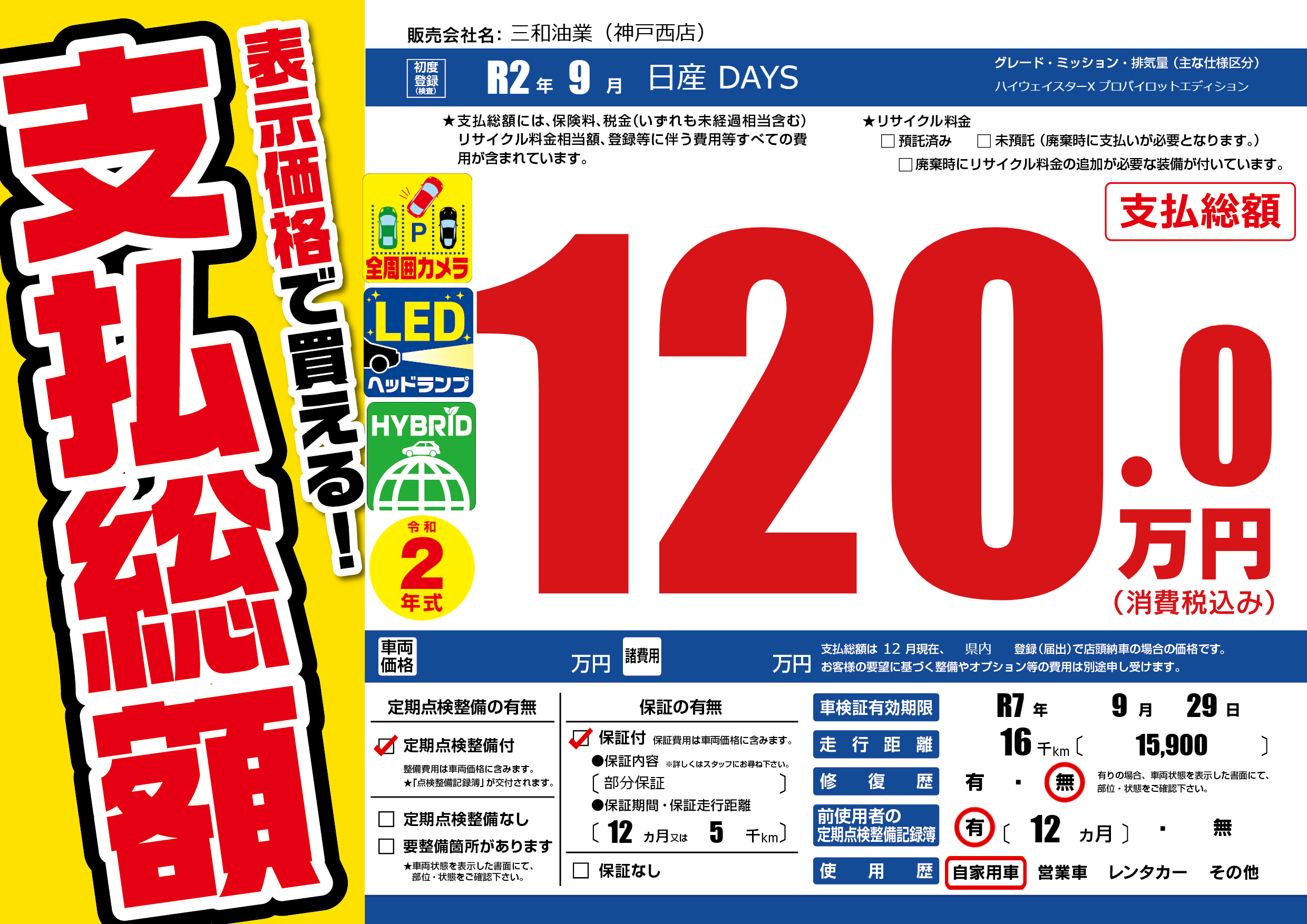 | 走行キロ | 1.6万km | 初年度登録 | R2年9月 |