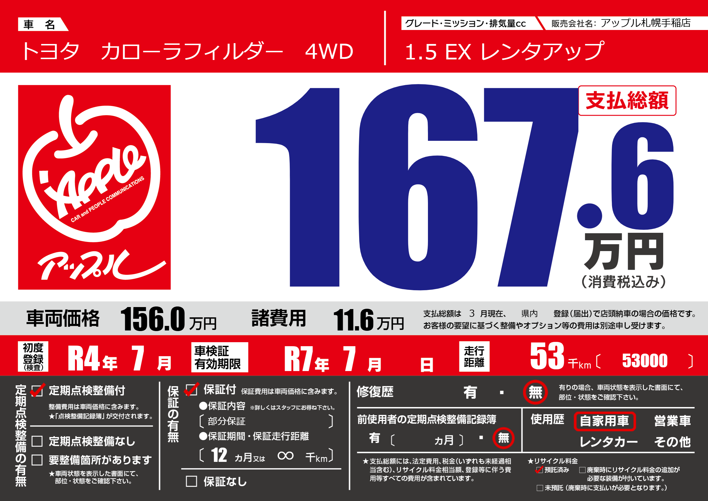 | 車名 | トヨタ カローラフィルダー 4WD | グレード ミッション 排気量 |