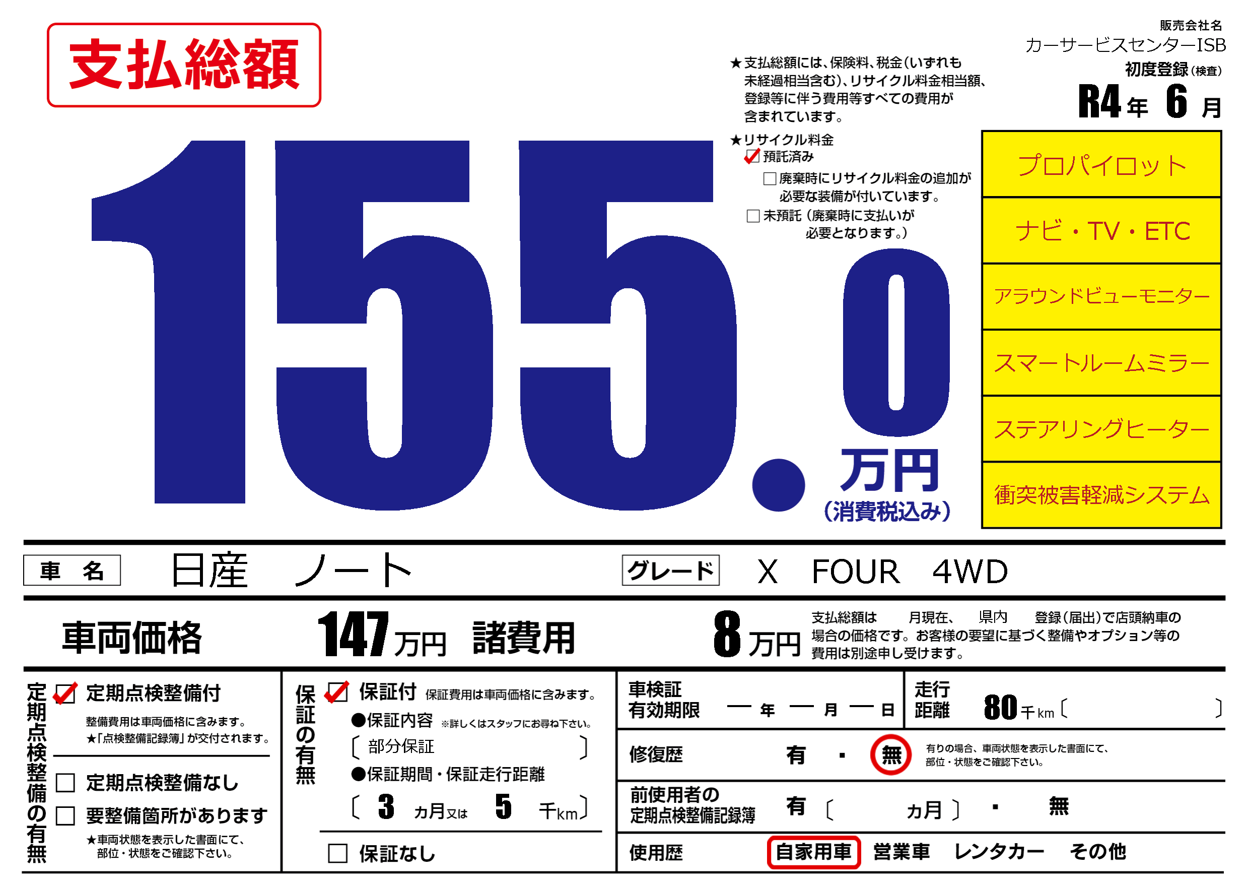 | 走行キロ | 8万km | 初年度登録 | R4年6月 |
