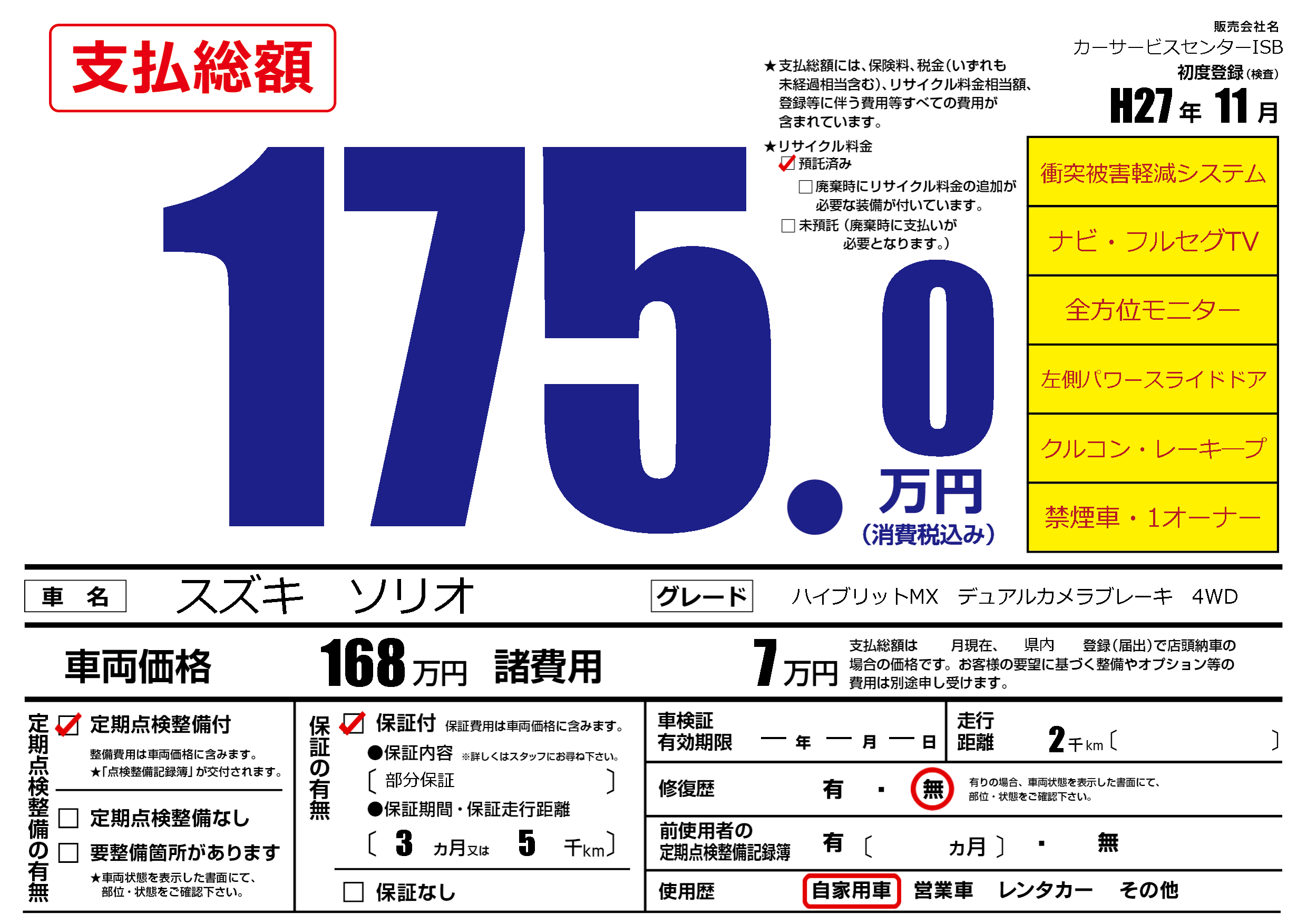 | 車名 | スズキ ソリオ | グレード ミッション 排気量 |