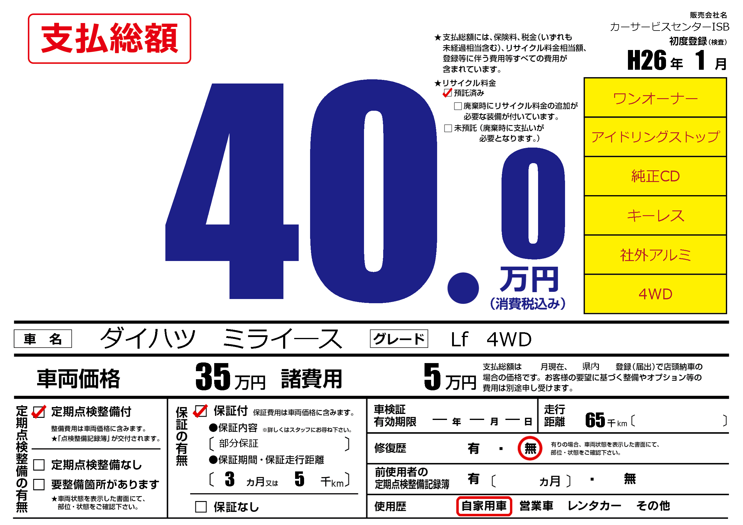 保証付き 保証内容(部分保証) 3ヶ月または(5)千kmまで |