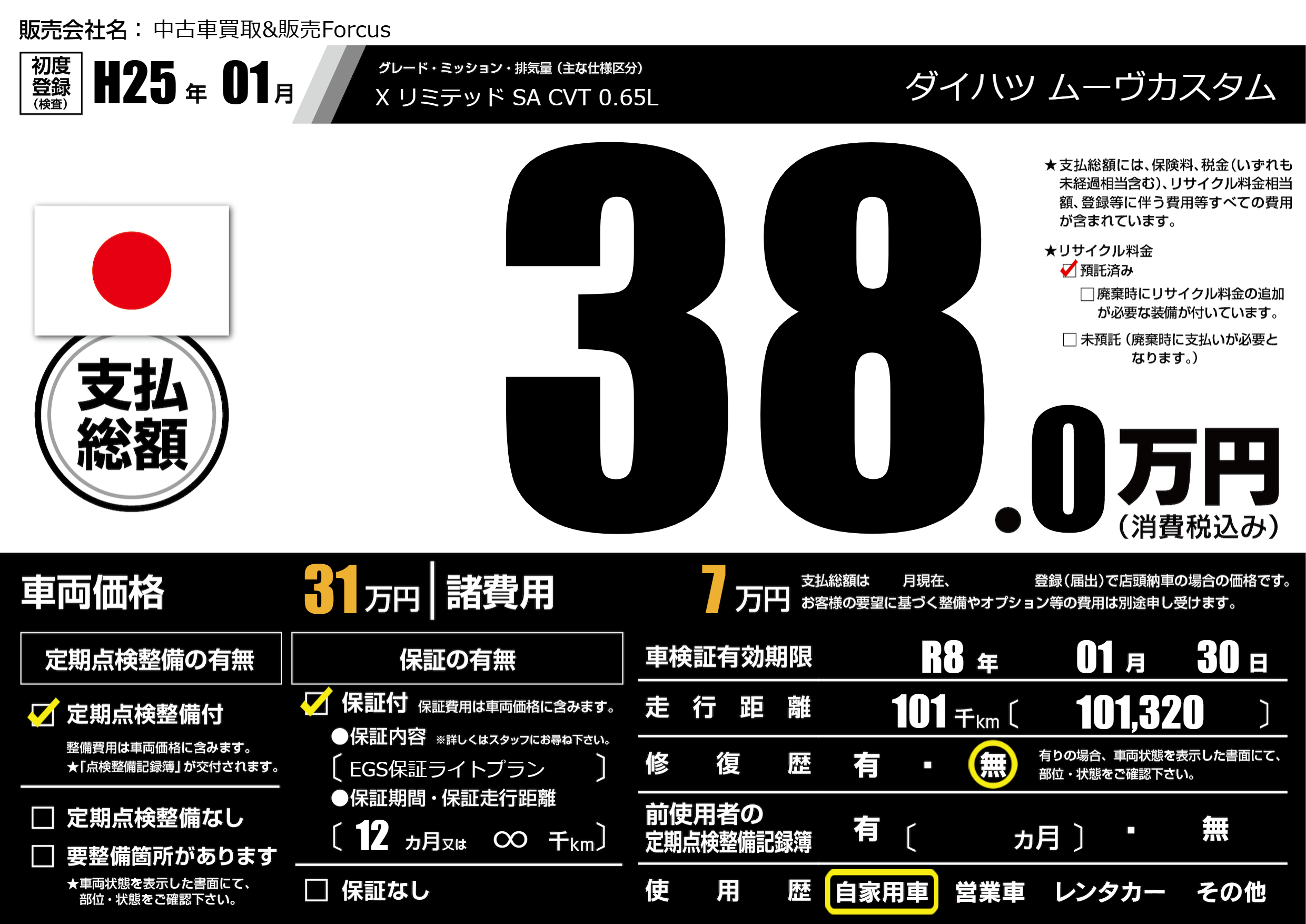 | 走行キロ | 10.1万km | 初年度登録 | H25年01月 |