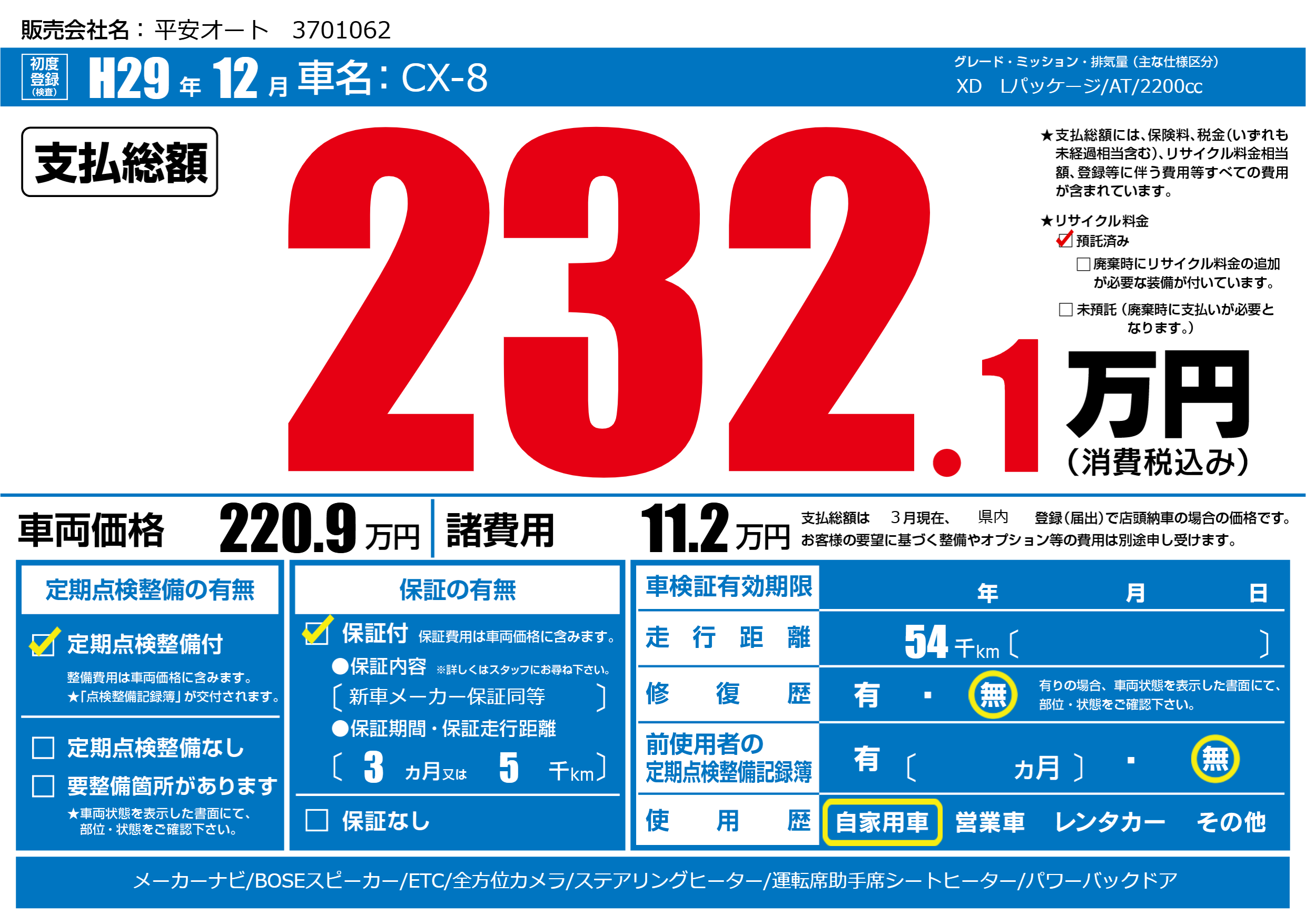 | 走行キロ | 5.4万km | 初年度登録 | H29年12月 |