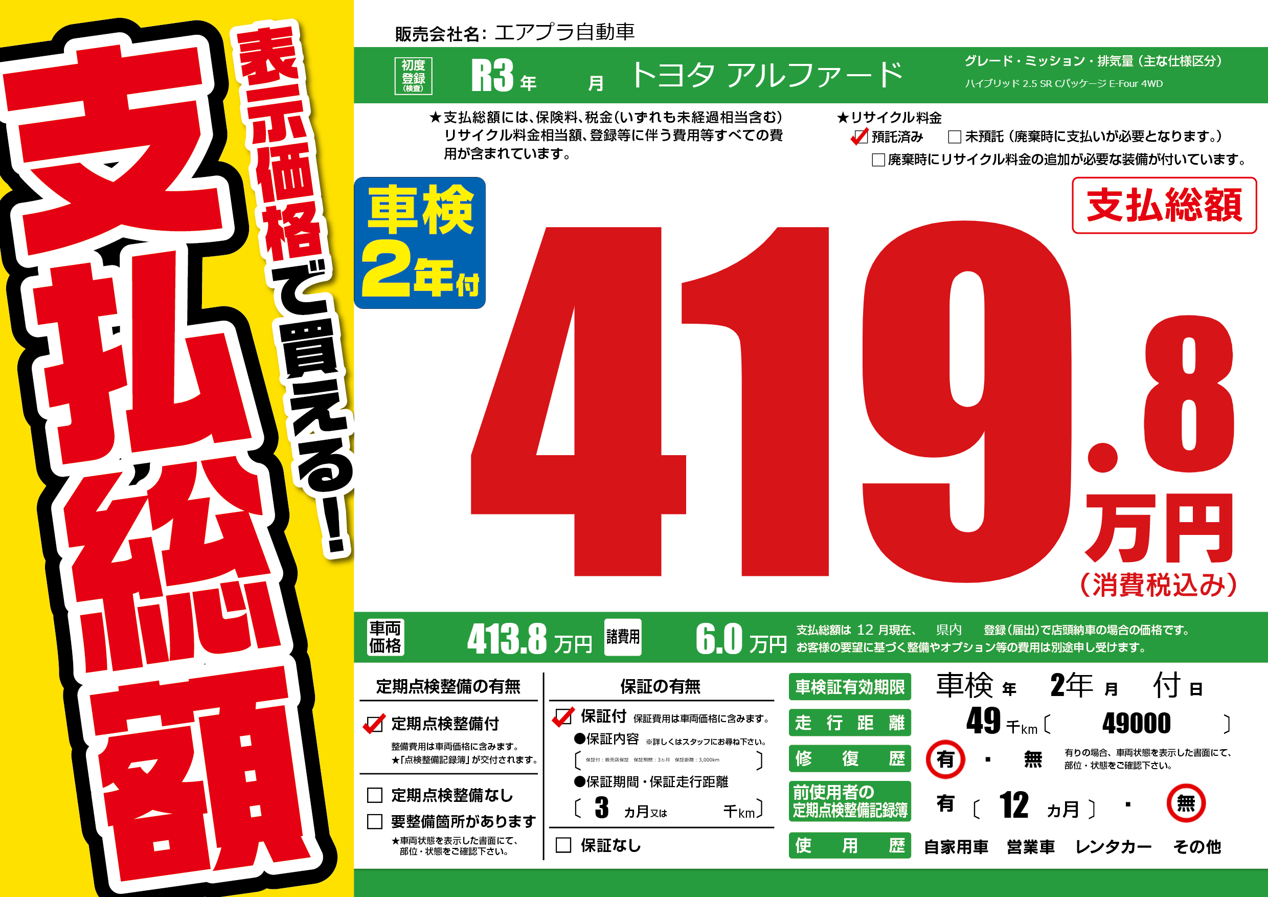 | 車名 | トヨタ アルファード | グレード ミッション 排気量 |