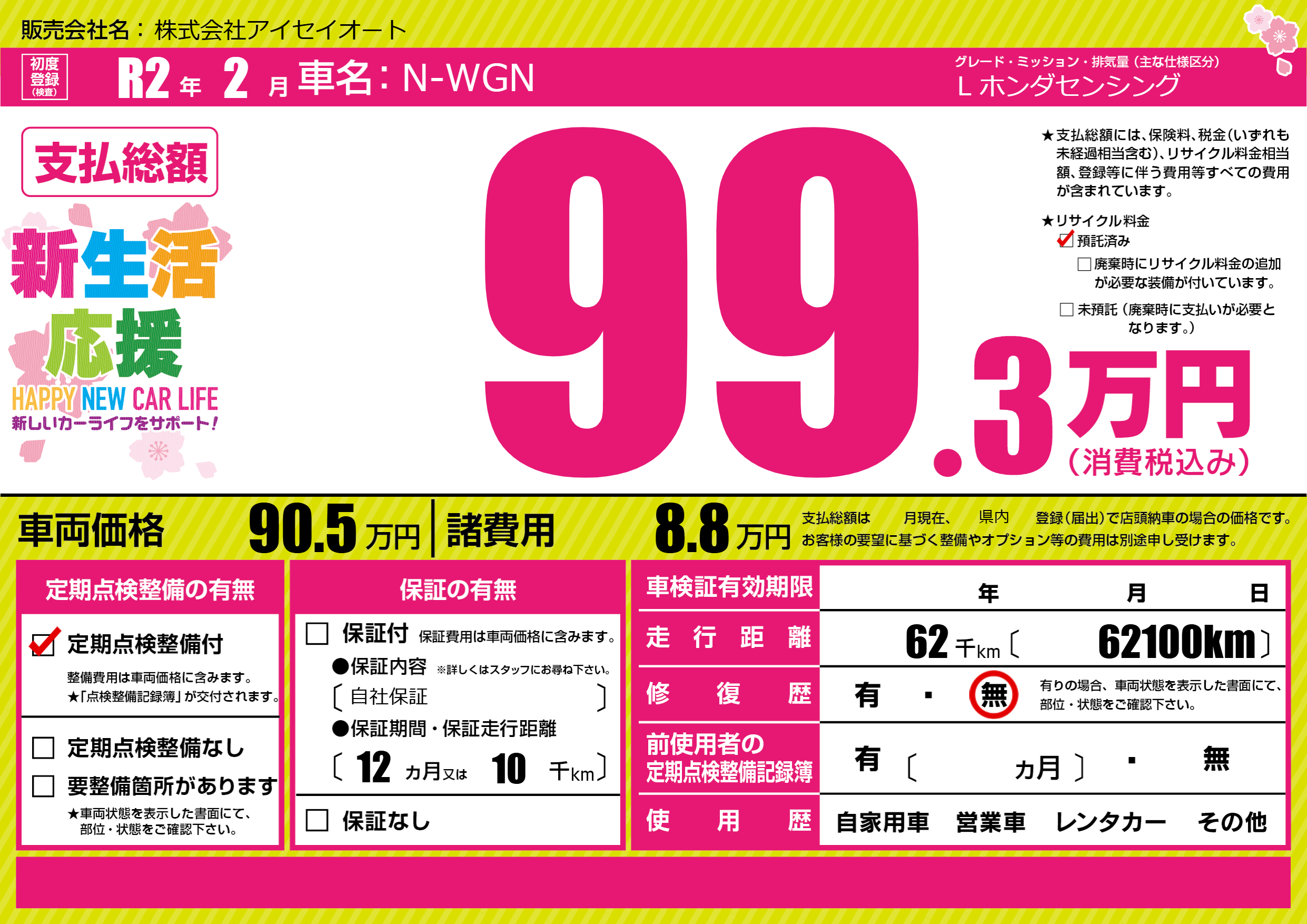 | 車名 | N-WGN | グレード ミッション 排気量 |