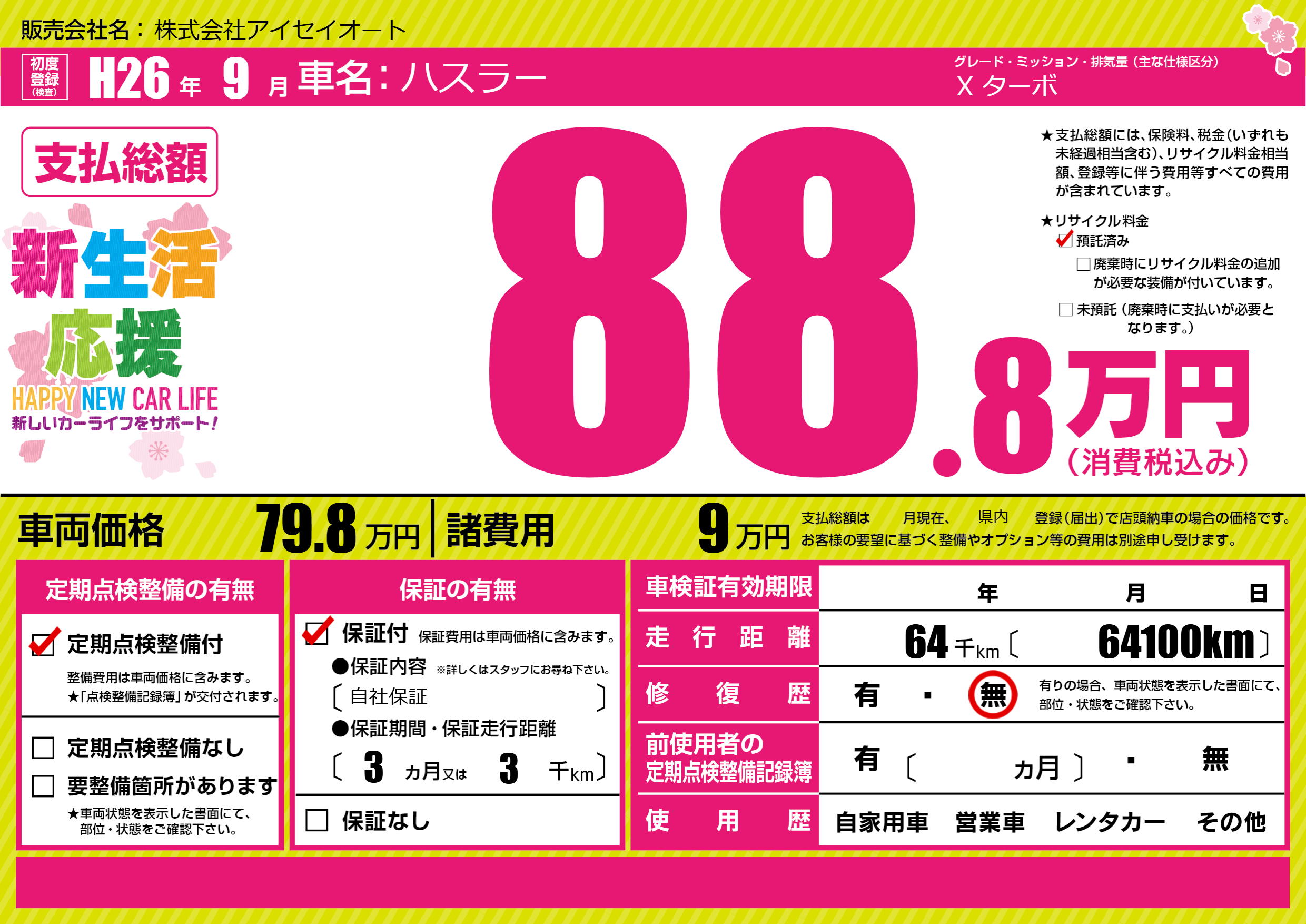 | 車名 | ハスラー | グレード ミッション 排気量 |