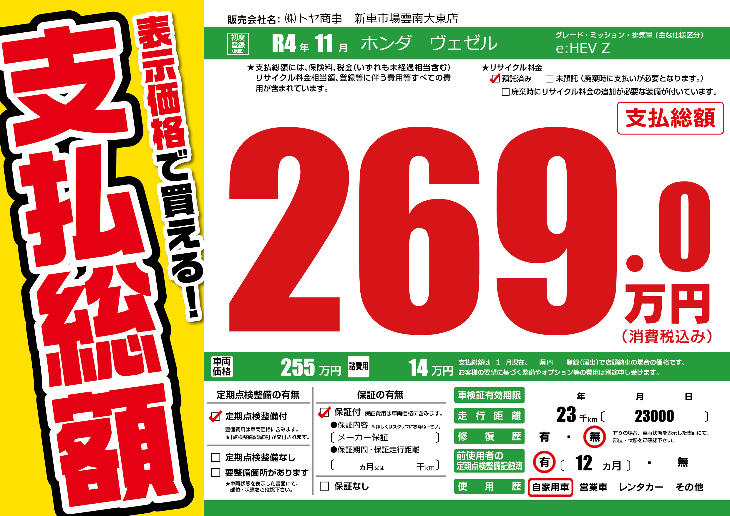 | 走行キロ | 2.3万km | 初年度登録 | R4年11月 |